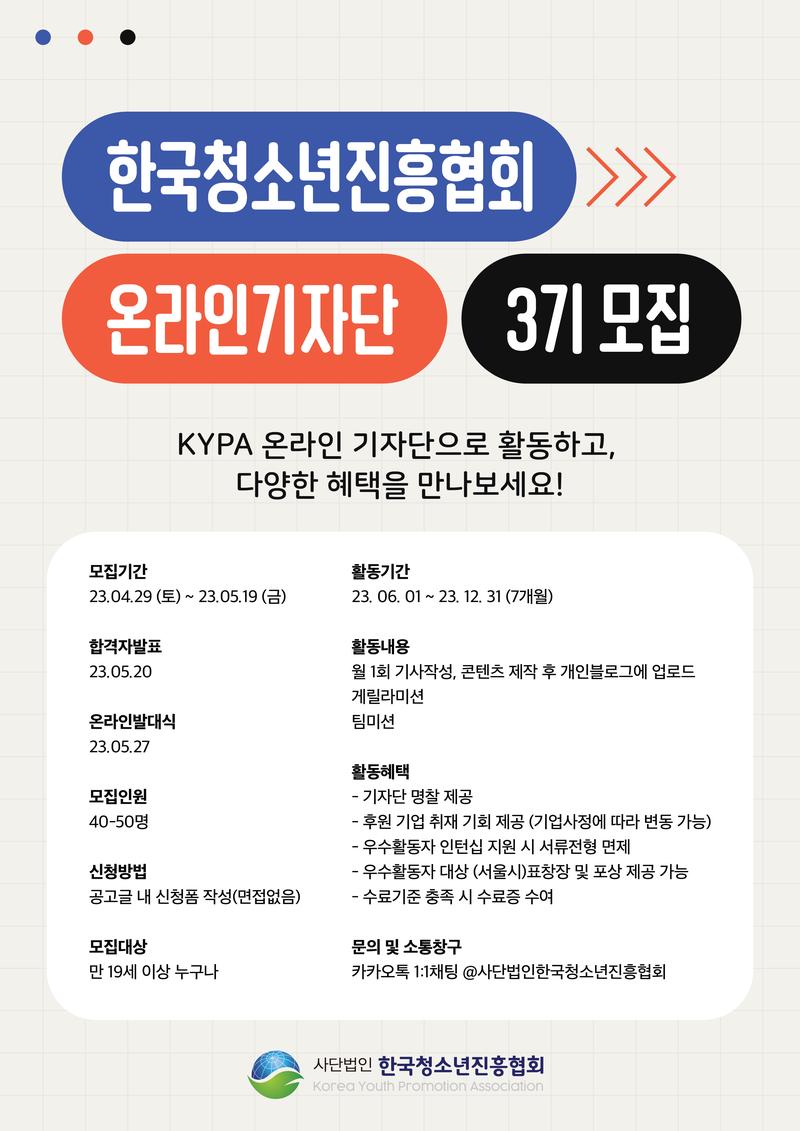 안녕하세요 KYPA 한국청소년진흥협회입니다. KYPA에서 온라인기자단 3기를 모집합니다!
