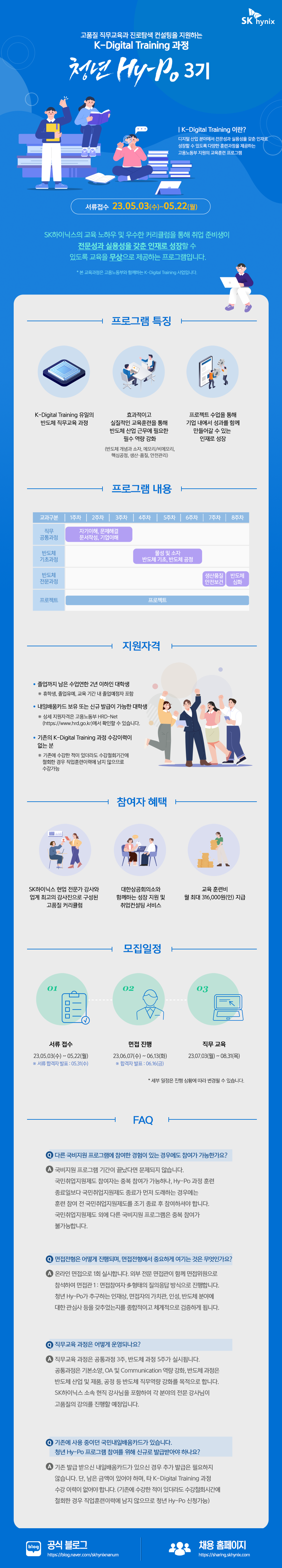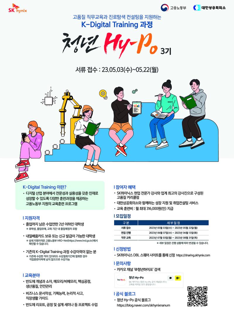 청년 Hy-Po는 SK하이닉스와 고용노동부와 함께하는 K-Digital Training 과정으로 고품질 반도체 직무교육과 진로탐색 컨설팅을 지원하는 프로그램입니다. 청년 Hy-Po는 반도체 산업 근무에 필요한 필수 직무역량을 강화하고 전문성과 실용성을 갖춘 인재로 성장할 수 있도록 반도체 기초·전문교육을 제공합니다. 모집공고 세부내용은 다음과 같습니다.