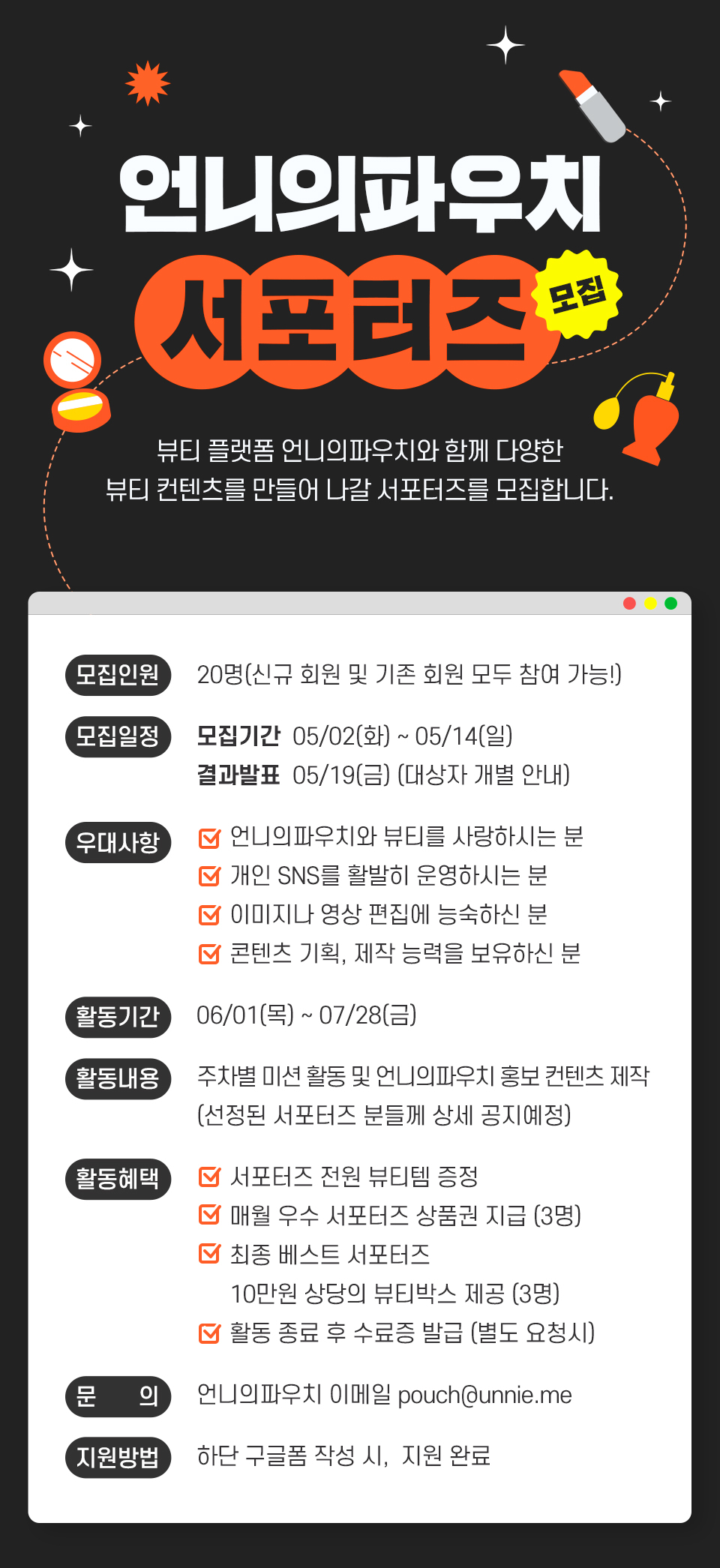 안녕하세요! 언니의파우치입니다🧡 언니의파우치를 널리 알려줄 언니의파우치 서포터즈를 모집합니다! 서포터즈 모집 내용과 혜택은 아래에서 확인해 주세요! 많은 관심 부탁드립니다 🙂