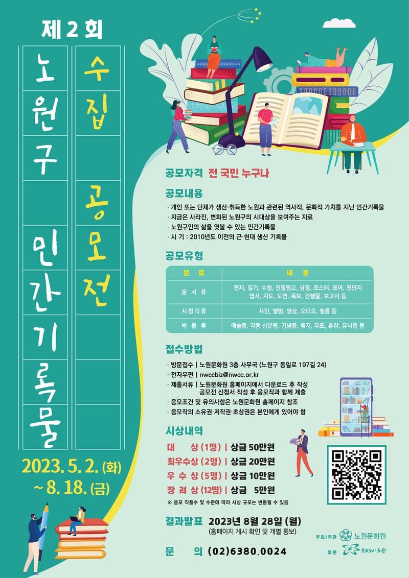 ■ 공모기간 : 2023. 5. 2.(화) \~ 8. 18.(금) 까지 ■ 공모내용 - 개인 또는 단체가 생산․취득한 노원과 관련된 역사적, 문화적 가치를 지닌 민간기록물 - 지금은 사라진, 변화된 노원구의 시대상을 보여주는 자료 - 노원구민의 삶을 엿볼 수 있는 민간기록물 - 시기 : 2010년도 이전의 근·현대 생산 기록물 ■ 공모유형 - 문서류 : 편지, 일기, 수첩, 친필원고, 상장, 포스터, 표어, 전단지, 엽서,지도, 도면, 족보, 간행물, 보고서 등 - 시청각류 : 사진, 앨범, 영상, 오디오, 필름 등 - 박물류 : 예술품, 각종 신분증, 기념품, 배지, 우표, 훈장, 유니폼 등 ■ 접수방법 : 노원문화원 방문접수·우편접수 혹은 전자우편(nwccbiz@nwcc.or.kr) - (01851) 서울특별시 노원구 동일로 197길 24(공릉동) ■ 시상금 : 총 2백만 원 노원문화원 홈페이지 공지사항에서 더욱 자세한 내용을 확인하세요! ☎ 문의 : 02-6380-0024 (노원문화원)
