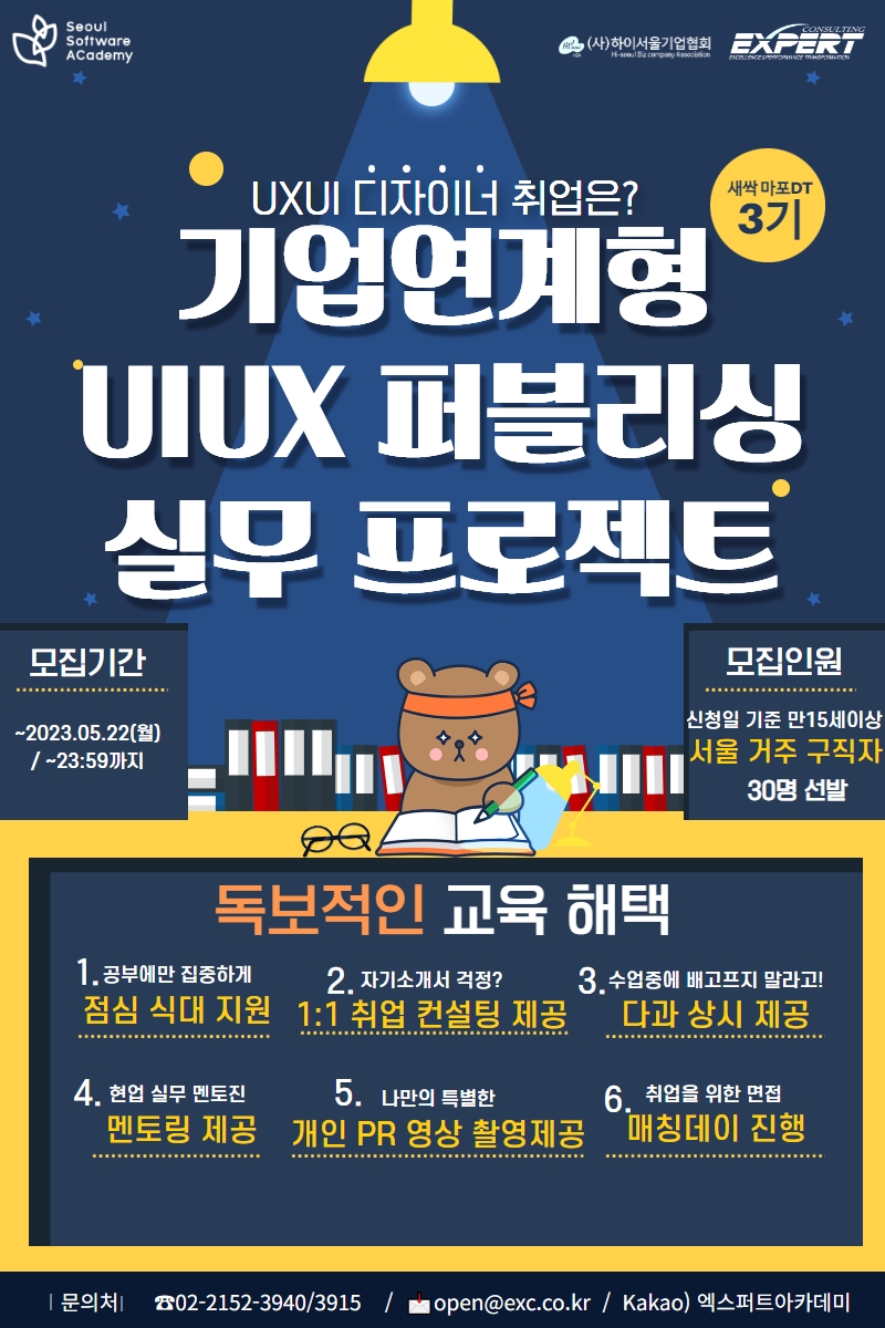 청년취업사관학교 새싹(SeSAC) 마포캠퍼스에서 기업연계형 UIUX 퍼블리싱 실무 프로젝트 과정 수강생을 모집합니다! 만 15세 이상 미취업자 서울시민이면 누구나! UIUX 디자이너로 성장하고 싶다면 지금 바로 신청해주세요! ■ 과정명 : 기업연계형 UIUX 퍼블리싱 실무 프로젝트 과정(\~5/22) ■ 주최 : SBA서울산업진흥원 ■ 주관 : 엑스퍼트컨설팅, 하이서울기업협회 ■ 모집안내 1. 모집기간 : 2023.04.10(월) \~ 2023.05.22.(월) 23:59 2. 모집대상 - 수강신청일(4/10) 기준, 만 15세 이상 서울시민 (최종 합격 시 등본 확인 필수) - 학습에 대한 의지가 있으신 분 - 교육수료 후 취업 또는 창업을 희망하시는 분 - 수강신청일(4/10) 기준 재직자 참여 불가 3. 모집인원 : 30명 ■ 교육안내 1. 교육 기간 : 2023.05.29(월) \~ 2023.08.22(화) 2. 교육 시간 : 매주 월\~금 09:00 \~ 18:00 (1일 8시간 교육 / 총 60일 480시간) 3. 교육 장소 : SeSAC 마포캠퍼스 (서울특별시 마포구 백범로31길 21 서울창업허브9층 / 공덕역 2번 출구 10분 거리) 4. 예치금 : 본 과정은 무료 교육이나, 의지 제고를 위한 예치금 10만원을 선납해야합니다. 예치금은 과정 수료 95% 이상일 때 반환하며, 미만인 경우 반환 불가합니다. ■ 프로그램 내용/교육내용 ※ 윈도우 기반 개인 노트북이 필요하니, 교육 전까지 준비해주세요. 1. 피그마 ♦ 피그마 기본 인터페이스와 도형툴, 이미지 가져오기, 히스토리 사용 저장, 펜툴, pathfinder, layout grid, mask, icon 그리기 ♦ 그라디언트, 피그마 파일공유 및 코멘트 툴, 컴포넌트 기본 개념 마스터와 인스턴스의 개념 ♦ 컴포넌트 사용하기, Constraints, 플러그인 커뮤니티 사용하기 ♦ 스타일 등록과 라이브러리 사용 ♦ 라이브러리 관리하기 Auto Layout 개념과 사용 ♦ Auto Layout 연습, Variants 다양한 상태를 정의하기 ♦ 토글버튼, hover 만들기, 탭 만들기 2. ADobe XD ♦ ADobe XD ♦ Asset, Component 사용하기 ♦ 액션기능 실습 : prototyping툴 기초 자동애니메이트 ♦ 액션기능 실습 : 오버레이, 스위치/토글 애니메이션 스크롤, 공유 ♦ Ui kit, 플러그인 활용 3. UX설계 ♦ Design Thinking, 디자인프로세스, UXUI 사용성, UIUX 환경 분석 ♦ 유저리서치, 유저 리서치의 기본 프로세스, 심층인터뷰기법 ♦ 사용자 모델링, 퍼소나 모델링, 조사방법론 ♦ 데이터 모델링, Journey Map, Blue print ♦ Affinity diagram, Feature List, customer feature list, backend feature list ♦ 정보구조 설계 Information Architecture, User Flow ♦ UX Writing, User Friendly ♦ 사용성 테스트, 목표, 가설, 그리고 프로토타입 준비하기, 가이드 문서 만들기 실전 사례 소개, A/B TEST 설계 및 결과 해석 4. UX미니프로젝트 5. UI 디자인 실습 6. 신입사원 비즈니스/기본교육 7. 취업컨설팅 8. 디자이너를 위한 코딩 9. CBP 기업연계 실무 프로젝트 ■ 참여 혜택 1. 학습지원 : 온라인 강의 제공, 필요도서 구입 및 제공, 회식지원, 간식제공 2. 현업 실무진 멘토 시스템 3. 개인 포트폴리오 제작 4. PR영상 촬영 지원 5. 식대 지원 6. 취업 컨설팅, 신입사원 교육 7. 교육전문 담당매니저의 밀착 관리 : 교육생 상담, 교육 운영 관리, 취업지원 8. 일자리 매칭데이 취업 기회 제공 ■ 지원 방법 및 절차 1. 지원방법 ※ 새싹 수강신청은 2단계로 진행되며, 단계를 모두 진행해야 지원이 완료됩니다. ▶ 1단계: 홈페이지 수강신청 https://img.exc.co.kr/academy/2023/2023DT/UXUI/UXUI.html ▶ 2단계: 팝업창의 자기소개서(구글폼) 작성 완료 후 제출 2. 선발절차 1차 서류전형 신청서 제출 → 선택형 교육상담 → 1차 서류 합격 → 2차 레벨테스트 및 면접 → 최종합격 ※ 선택형 교육상담은 필수사항은 아니지만 선발 시 가산점을 부여합니다. ※ 상담은 1차 서류 신청접수 기간 내 이루어집니다. ■ 신청기간 - 1차 신청서 접수 : 2023.04.10(월) \~ 2023.05.22(월) (23:59 까지) - 1차 합격자 발표 : 2023.05.23(화) 오후 2시 (합격자/불합격자 모두 개별적으로 안내 예정) - 2차 레벨테스트 및 면접 평가 : 2023.05.24(수) - 최종합격자 발표 : 2023.05.25(목) (합격자/불합격자 모두 개별적으로 안내 예정) ※ 상기 일정은 변동될 수 있으며, 사전 OT 일정은 최종 합격자에게 따로 안내 예정입니다. ※ 본인 착오로 인해 면접 일정을 확인하지 못한 경우 개별적으로 일정 변동이 어려운 점 미리 안내드립니다. ■ 문의처 ♦ 전 화 : 02-2152-3940/3915 ♦ 이메일 : open@exc.co.kr ♦ 카카오 : 엑스퍼트아카데미