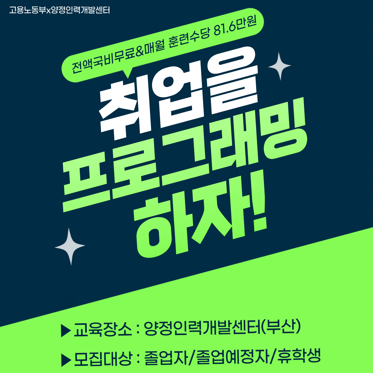 👨 취준생분들을 위한 양정인력개발센터만의 혜택💻 ▶7,530,250 원 교육비 전액국비지원 ▶전 교재 및 학습자료 무상제공 ▶매월 최대 81.6만원 훈련수당 제공 ▶산업체 실무 맞춤형 포트폴리오 제작 ▶SW/IT 기업 취업지원서비스 제공 ▶과정 종료 후 훈련 수료증 제공 ▶실무 경험 풍부한 강사님의 멘토링 ▶양질의 훈련 인프라 보유(고사양 장비) ● 교육대상 - IT분야로 취업을 희망하는 분 (졸업자/졸업예정자/3학년이상휴학생) 🔍 지원방법: https://www.jobyj.co.kr/ (온라인 수강신청 접수) * 담당자 확인 후 접수자 별도 연락드릴 예정입니다. * 20명 선착순 모집으로 조기 마감될 수 있습니다. ● 교육일정 - 2023.07.12\~ 12.19 - 월\~금 9:00\~ 17:30 (8교시) ● 교육장소 고용노동부 5년인증 우수훈련기관 양정인력개발센터 (부산 지하철 양정역 2번 출구 도보 150m 지점, 6층) ● 문의처** 양정인력개발센터 ☎ 전화문의: 051-851-7887 ▶ 카카오톡 상담: edu8989