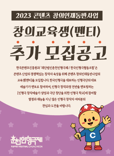 [2023 콘텐츠 창의인재동반사업] 창의교육생(멘티) 추가 모집 공모 안내 한국콘텐츠진흥원과 '재단법인춘천인형극제/한국인형극협동조합'은 콘텐츠 산업의 경쟁력있는 창작자 육성을 위해 콘텐츠 창의인재동반사업의 교육생(멘티)를 모집합니다. 한국 인형극을 대표하는 인형극단의 대표 예술가가 멘토로 참여하여, 인형극 창작과정 전반을 멘토링하는 [인형극 창작예술가 양성과 극단 창단을 위한 인형극 학교]에 참여할 열정과 재능을 지닌 많은 인형극 창작자 여러분의 관심과 도전을 바랍니다. 미래 콘텐츠 산업을 이끌어갈 청년 창의인재 양성을 위해 창작 분야의 현장 전문가(멘토)를 통한 도제식 멘토링을 지원하여, 청년 인재의 창작능력 개발과 콘텐츠산업계 진출을 지원하고자 합니다. ■ 모집개요 1. 멘토링 프로그램명: 인형극 창작예술가 양성과 극단 창단을 위한 인형극학교 2. 모집분야: 인형극 예술가 3. 지원자격: 신청일 기준 만 18세 이상 만 34세 이하\, 창작의 소질과 소양을 갖춘 예비 창작자 * 2012\~2022년도 본 사업에 참여하여 과정을 이수한 창의교육생(멘티)은 1회에 한해 재신청 가능 (단, 기관 총 선발인원의 10% 이하로 선발) 4. 멘토링 기간: 협약체결일 \~ 2023.11.18 까지 5. 지원내역: 멘토를 통한 개별 멘토링\, 다양한 집체 교육\, 월 1\,500\,000원 지급 등 ■ 접수방법 1. 접수기간: 2023년 5월 2일 (화) \~ 5월 8일 (월) 오전 10시까지 2. 접수 방법: 춘천인형극제 홈페이지에서 신청서류 다운 후 구글폼 신청서 접수 (http://www.cocobau.com/) 3. 신청 서류 - 창의교육생 참여신청서 1부 - 자기소개서 1부, 참여자격 확인 및 서약서 1부 - (필수) 2023년 프로젝트 작품계획서 1부 * 신청서 및 첨부서류는 압축하여 하나의 파일로 제출 (파일명: 신청서_신청자 성명.ZIP) 4. 결과발표: 합격자에 한해 개별 공지 예정 5. 문의 사항 - 전화: 033-242-8452 - 이메일: cocobausupport@cocobau.com - 문의 가능 시간: 화\~ 금 10:00 - 18:00