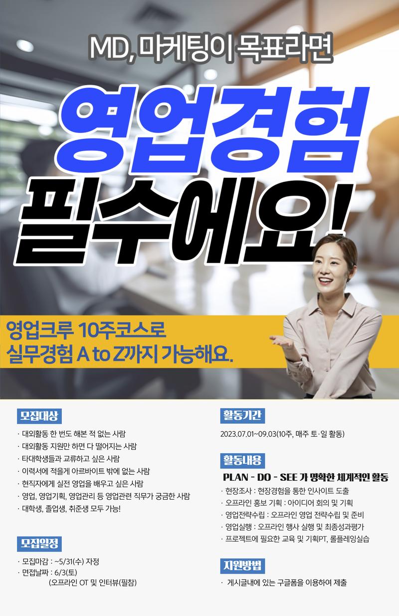 ▶ 활동 혜택 1. 현직자영업 실무강의 및 프로젝트 피드백 2. 프로젝트담당 실무진의 집중케어 멘토링 3. 제대로된영업 실무경험! 기획부터 현장경험까지! 4. 2년연속외국계 기업 TOP영업 실적의 찐 노하우 전수!