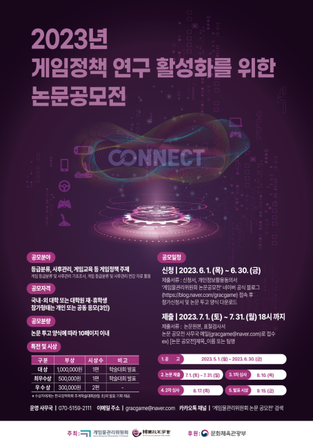 ○ 제 출: 2023. 7. 1.(토) \~ 7. 31.(월) 18:00까지 공식메일(gracgame@naver.com) 통한 온라인 접수 (메일제목은 [논문 공모전]제목_이름 또는 팀명으로 작성) (*예시 [논문공모전]제목_OOO) ※ 제출서류 : 신청서(붙임1)(PDF) 1부, 개인정보활용동의서(붙임2)(PDF) 1부, 논문원본(PDF) 1부, 표절검사결과확인서(PDF) 1부 (압축(zip) 하여 제출) (*표절검사결과확인서 15% 미만 제출 가능 (카피킬러, 턴잇인, KCL 등 이용)