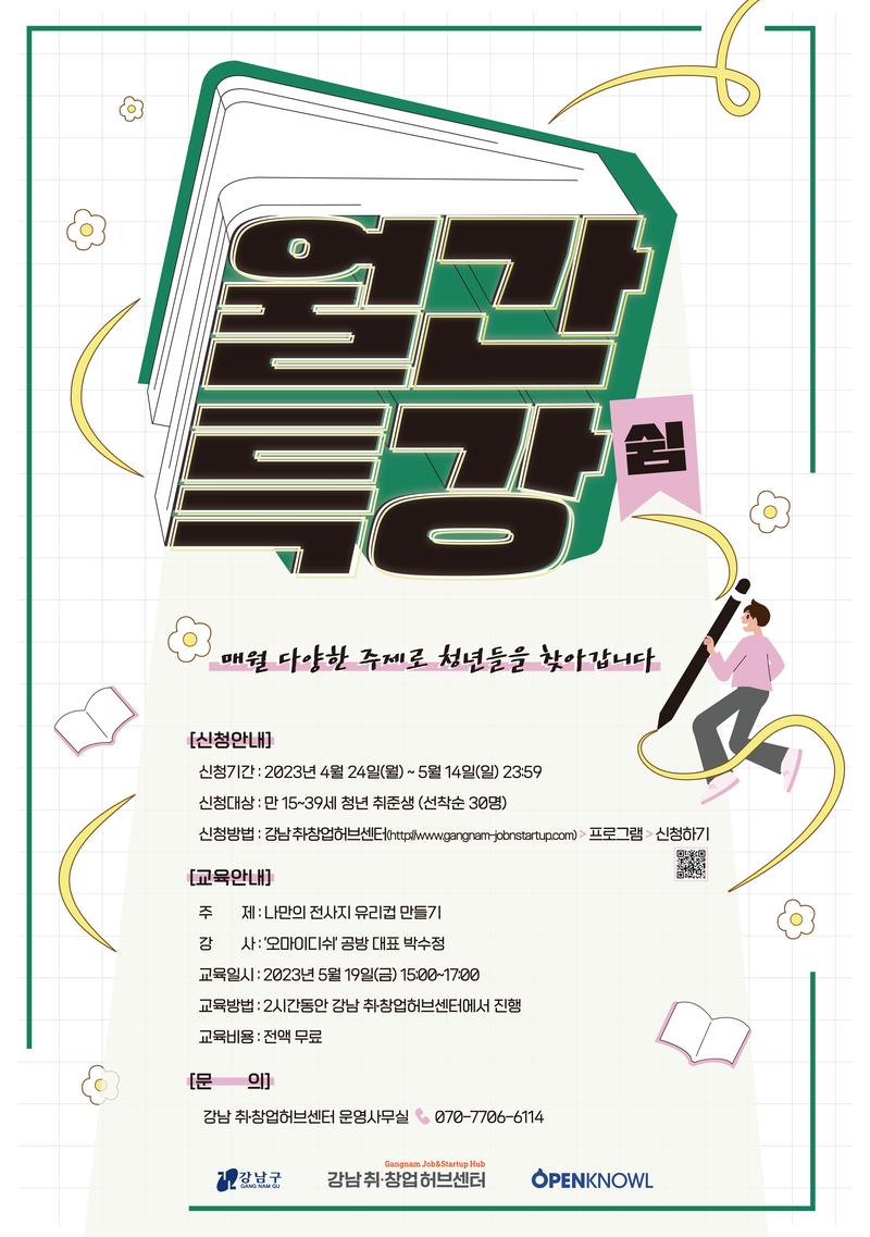 [신청안내] 🟧 신청기간 : 2023년 4월 24일(월) \~ 5월 14일(일) 23:59 🟧 신청방법 : 강남 취•창업허브센터 (http://www.gangnam-jobnstartup.com) > 프로그램 > 신청하기 ※ 자세한 내용은 홈페이지를 통해 확인 바랍니다.