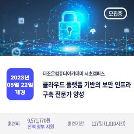 [더조은아카데미 - 서초캠퍼스] 훈련과정 - [K-Digital] 클라우드 플랫폼 기반의 보안 인프라 구축 전문가 양성과정 교육일정 - 2023년 05월 22일 \~ 2023년 11월 22일 교육시간 - 09:30 \~ 18:30 (주5일 수업 / 일일 8시간) 교육비용 - 전액국비지원 교육문의 - 02-703-7025 / ocm7607@naver.com