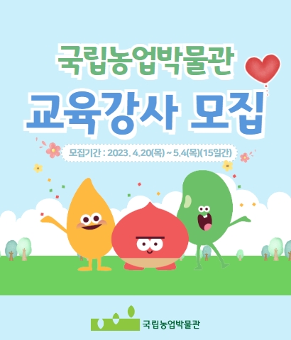 국립농업박물관 2023년 제1차 교육강사 모집 공고 우리 박물관에서는 수준 높은 교육서비스를 제공하기 위하여 다음과 같이 교육강사를 모집하오니 많은 관심 바랍니다. 2023년 4월 20일 국립농업박물관장 ㅁ 개요 ㅇ 기간 : 위촉일 \~ ’23.12.31.(일) * 프리랜서이며, 1년 단위로 평가 후 재위촉 가능 ㅇ 시간 : 교육일정에 준하여 강의 * 교육일정에 따라 주말, 휴일, 야간 근무 가능 ㅇ 대상 : 지원분야의 자격요건을 충족하는 자 ㅇ 장소 : 국립농업박물관(경기도 수원특례시 소재)