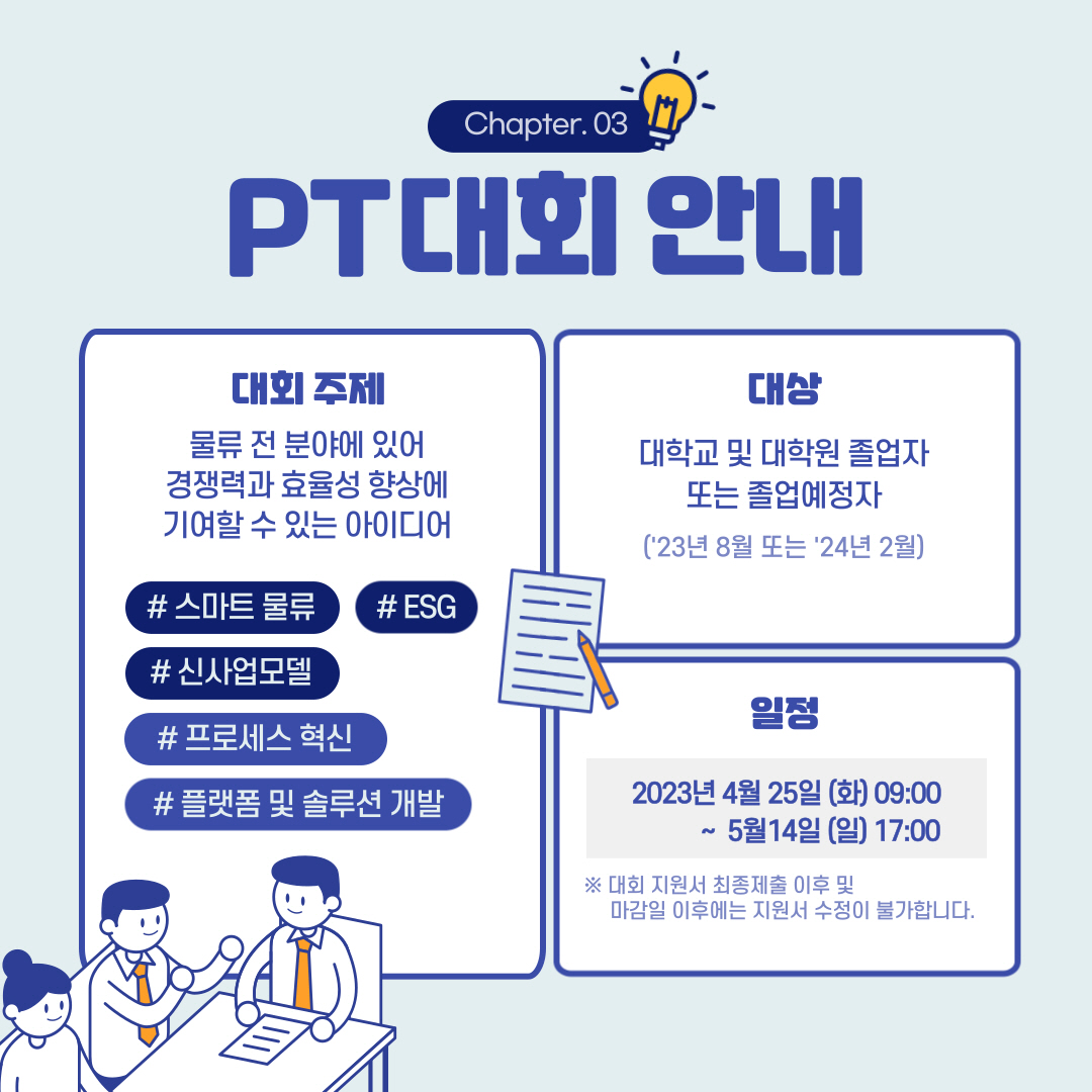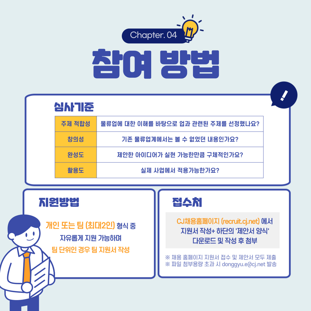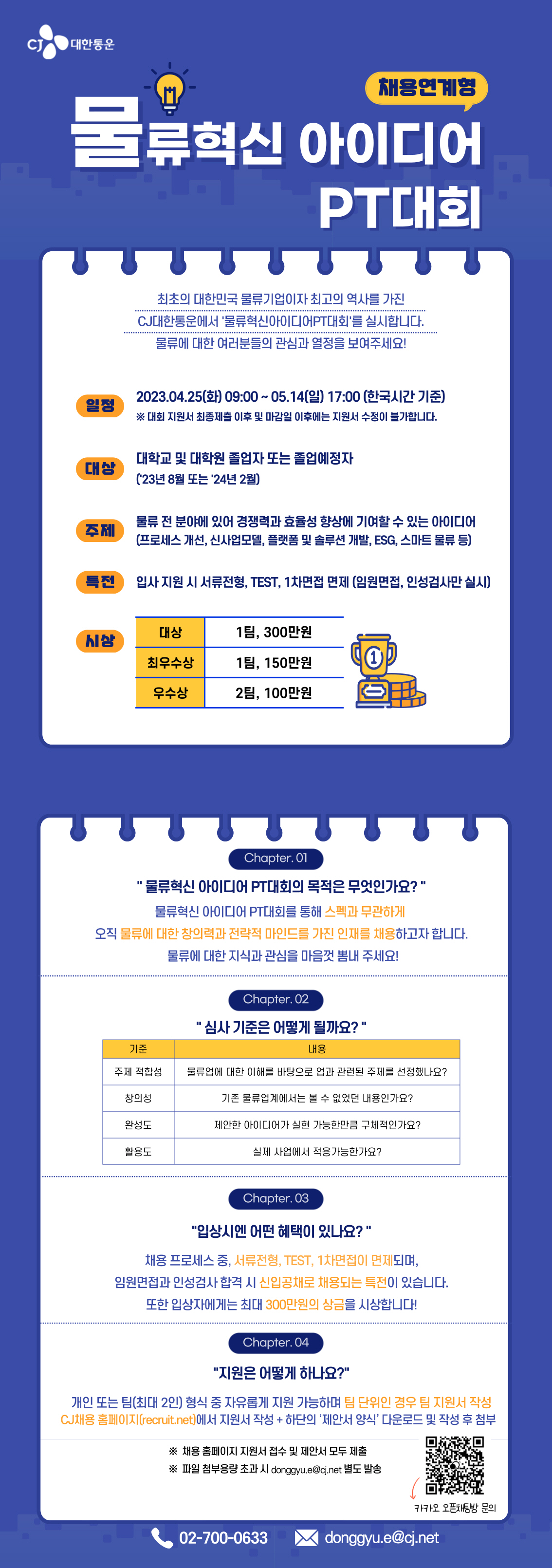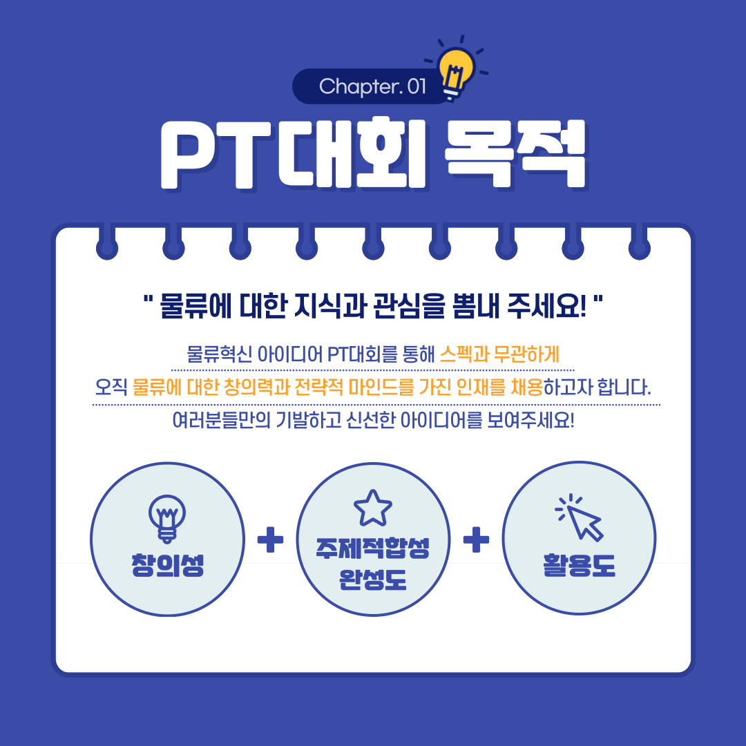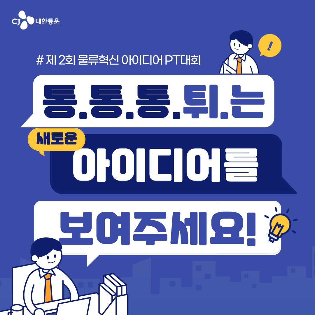 - 최초의 대한민국 물류기업이자 최고의 역사를 가진 CJ대한통운에서 '물류혁신아이디어PT대회'를 실시합니다. 해당 대회를 통해 스펙과 무관하게 오직 물류에 대한 창의력과 전략적 마인드를 가진 인재를 채용하고자 합니다. 물류에 대한 여러분의 지식과 관심을 마음껏 뽐내 주세요!