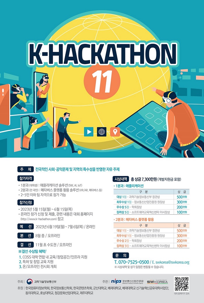 ■ 응모주제 전국적인 사회문제와 공익 문제 및 지역의 특수성을 반영한 자유 주제 - 1분과 : 애플리케이션 솔루션(SW\, AI\, IoT) - 2분과 : 메타버스 플랫폼 활용 솔루션(VR/AR\, 메타버스 등) ■ 응모자격 - 1분과 : 대학생(휴학생 가능\, 자퇴/대학원 소속은 불가) - 2분과 : 대학생을 포함한 전 국민 * 2인 이상 5인 이하로 구성된 팀(기존 창업 및 서비스하는 팀은 제외) * 제주 지역 예선은 권역에 상관없이 모든 권역 참가 가능 (단, 해당 권역을 우선으로 접수 진행 : 접수 상황에 따라 타 권역 지원자는 접수 순서에 따라 접수 취소될 수 있음) ■ 접수방법 온라인 참가 신청 및 제출, 관련 내용은 대회 홈페이지(http://www.k-hackathon.com/) 참고 ※ 메타버스, VR/AR 등 실감콘텐츠 관련 주제 우선 선발 ※ 2분과의 경우 지역 거주지 기준 접수 ※ 같은 권역 내 대학생들로 구성하여 해당 권역에만 참가(같은 권역 타 대학팀 연합은 가능) ※ 제주 권역은 해당 권역을 우선으로 선발하되, 여유 인원이 있을 경우 지역 상관없이 추가 모집 진행 단, 타 권역 참가자도 본선 등은 제주 일정을 따라야 함 ※ 예선은 해당 권역 1회만 참가 가능(타 권역 중복 참가 시, 모든 예선에서 자동 탈락 처리) ※ 모집 종료 후 팀원 변경 절대 불가 ※ 위 상기 내용은 변경될 수 있음 ■ 일정 참가신청 : 2023년 5월 15일(월) \~ 6월 15일(목) 예선 : 2023년 6월 19일(월) \~ 7월 6일(목) 본선 : 8월 중/권역별 진행/오프라인 결선 : 11월 초/수도권/오프라인 ■ 시상내역 1분과 대상(1) : 500만원 + 과학기술정보통신부 장관상 최우수상(1) : 300만원 + 정보통신산업진흥원 원장상 우수상(5) : 각 200만원 + 학회장상 장려상(5) : 각 100만원 + 소프트웨어교육혁신센터 이사장상