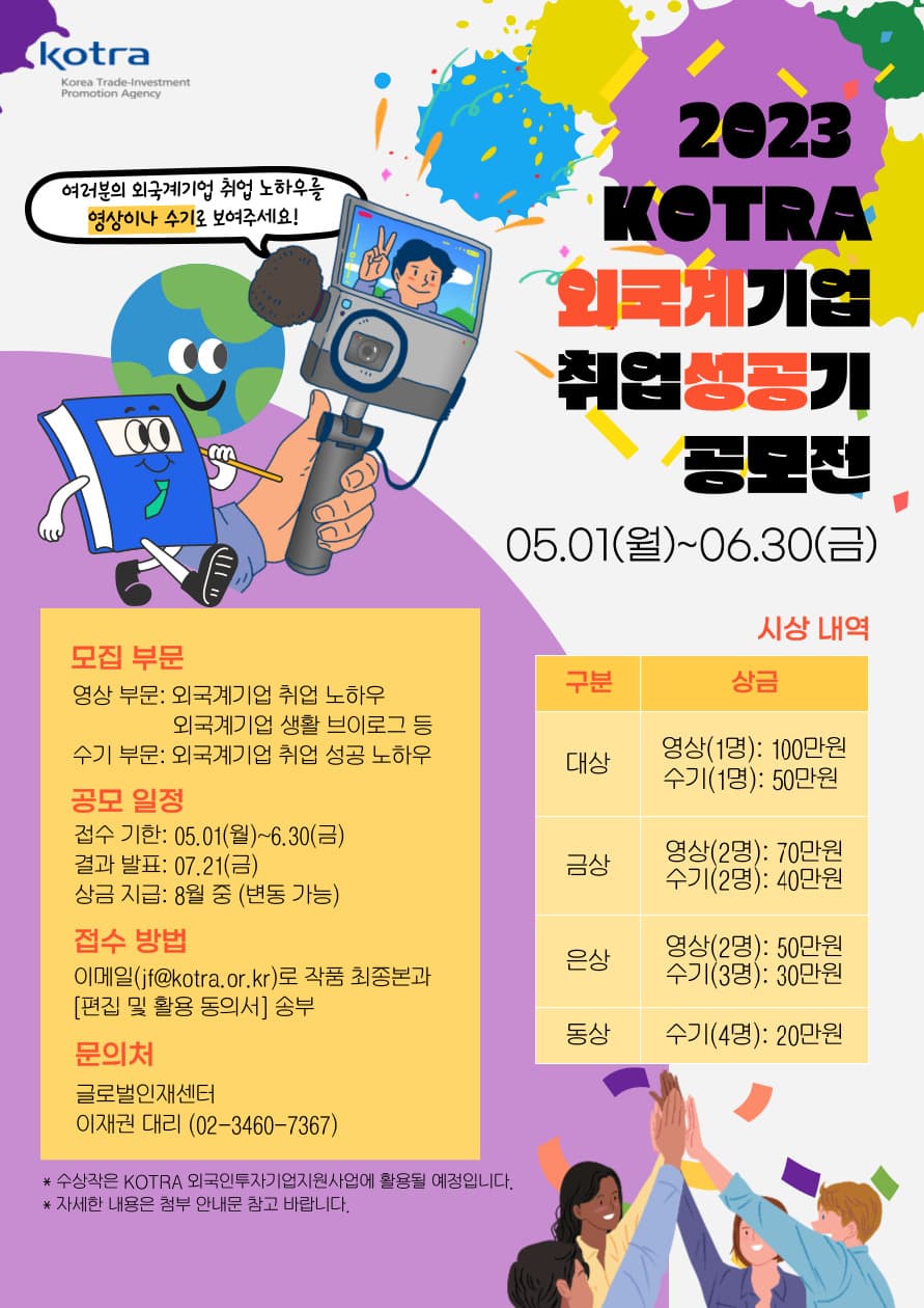 ▶ 유의사항 - 본 공모전과 동시에 진행되는 2023 KOTRA 해외취업 성공기 공모전과의 중복 지원 불가합니다. - 제출된 서류는 반환되지 않으며\, 저작권 등의 문제가 있는 경우는심사에서 제외될 뿐 아니라 이와 관련하여 발생하는 모든 책임은 응모자에게 있습니다. - 수상작의 저작권은 KOTRA에 귀속됩니다
