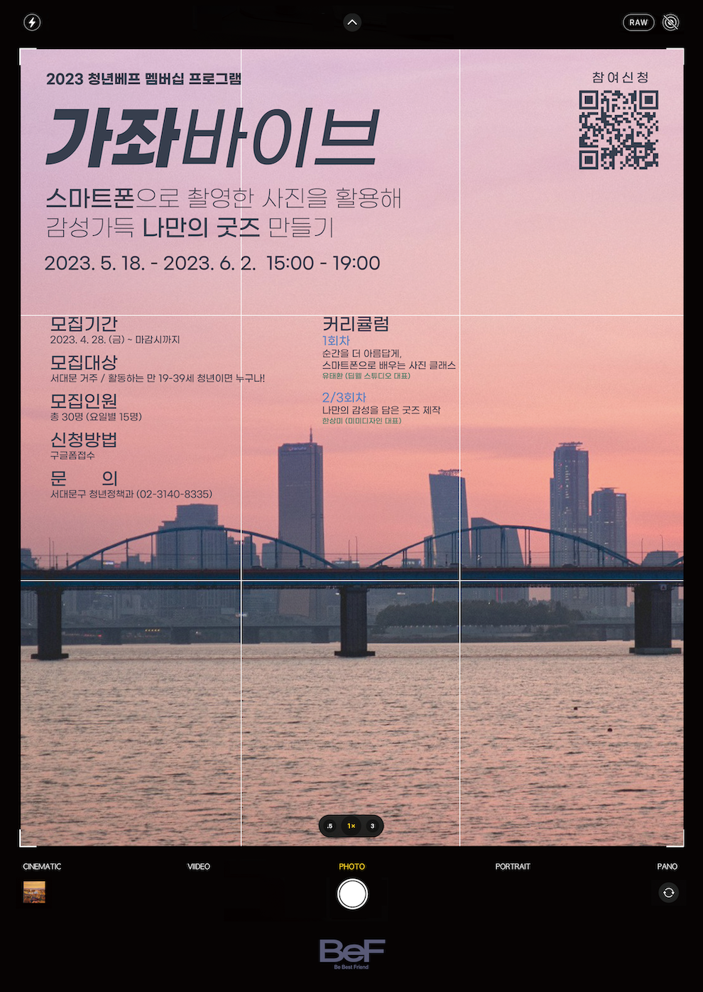 □ 모집개요 ○ 모집기간 : 2023. 4. 28(금) \~ 마감시까지 (선착순) ○ 지원자격 : 서대문 거주 / 활동하는 만19세-만39세의 청년이라면 누구나 ○ 모집인원 : 요일별 15명, 총 30명 ○ 지원방법 : 구글폼 제출⬇️ https://forms.gle/j3o2queAzoLWtrCe7 *신청 후 노쇼의 경우 2023년 청년베프 프로그램 참여가 불가한 점 안내드립니다.