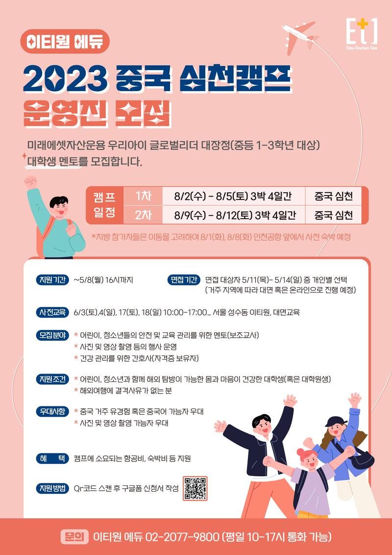 미래에셋자산운용에서는 대한민국의 어린이, 청소년들이 더 넓은 세상을 경험하여 글로벌 시각을 갖출 수 있도록 해외 선진도시 탐방을 진행하고 있습니다. 아래와 같이 중국 심천캠프를 진행하고자 하오니 많은 관심과 참여를 부탁 드립니다.
