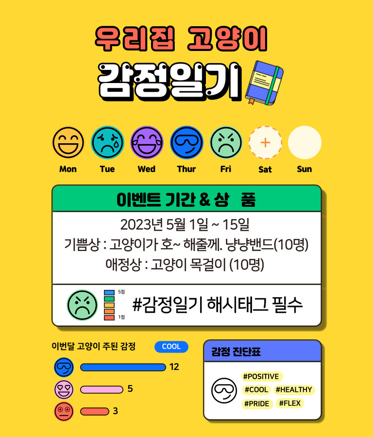 사랑과 애정, 불안, 분노.... 때론 극대노👿 기쁨, 즐거움 ... 지금 우리 고양이는 어떠한 감정인가요? 집사로써, 우리 고양이가 편안하고 행복함을 만끽할 수 있도록 고양이의 행동과 감정을 매일 관찰하고 기록해봐요.