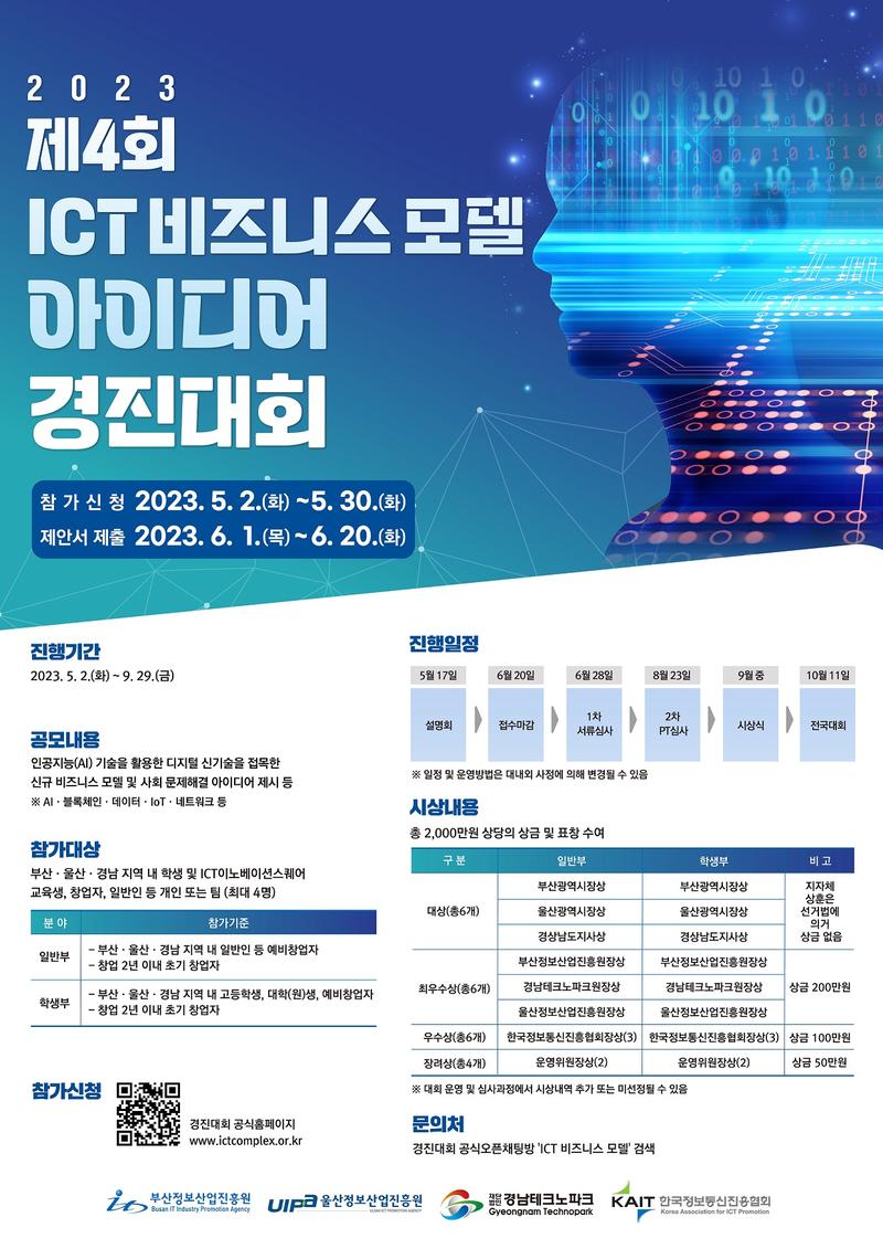 ※ 대회 운영과정에서 시상내역은 변경될 수 있으며, 심사기준에 부합되는 응모작이 없을 때, 해당 부분 수상자를 선정하지 않을 수 있음 [모집 안내] ○ 신청자 접수 : 2023. 5. 2.(화) \~ 5. 30.(화) ○ 제안서 제출 : 2023. 6. 1.(목) \~ 6. 20. (화) ○ 공식홈페이지를 통해 접수 및 제출 http://www.ictcomplex.or.kr/ ※ 신청자 접수를 하지 않으면 제안서 제출이 되지 않으니 사전 신청자접수를 꼭 먼저 해주시기 바랍니다. [문의]** ○ 경진대회 공식오픈채팅방 : https://open.kakao.com/o/g2SWmDdf
