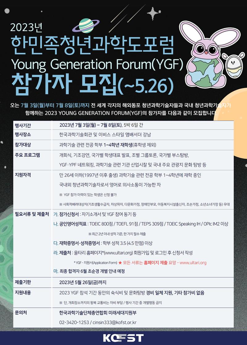 국내 미래세대 대표가 되어 전 세계 한인 과학기술인과 소통할 수 있는 절호의 기회✨ 🥳 대학 생활·대학원 생활에서 가장 기억에 남을 추억이 될 YGF·YPF를 놓치지 마세요!