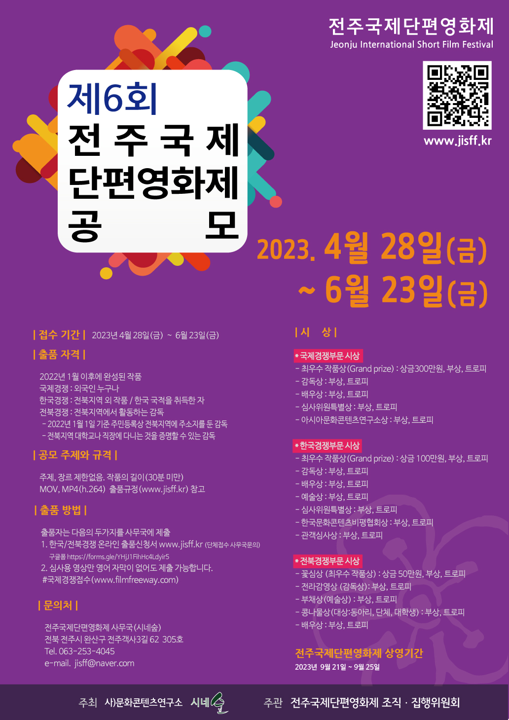 접수기간 2023년 4월 28일(금) \~ 6월 23일(금) 출품자격 2022년 1월 이후에 완성된 작품 국제경쟁 : 외국인 누구나 한국경쟁 : 전북지역 외 작품 / 한국 국적을 취득한 자 전북경쟁 : 전북지역에서 활동하는 감독 -2022년 1월 1일 기준 주민등록상 전북지역에 주소지를 둔 감독 -전북지역 대학교나 직장에 다니는 것을 증명할 수 있는 감독