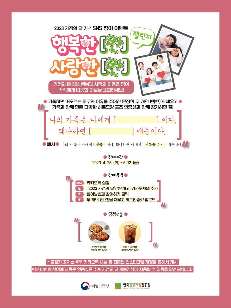 ■ 문의 * <2023 가정의 달> 카카오톡 채널 : http://pf.kakao.com/_xnhNxkxj * 한국건강가정진흥원 인스타그램 : https://www.instagram.com/kihf_korea/