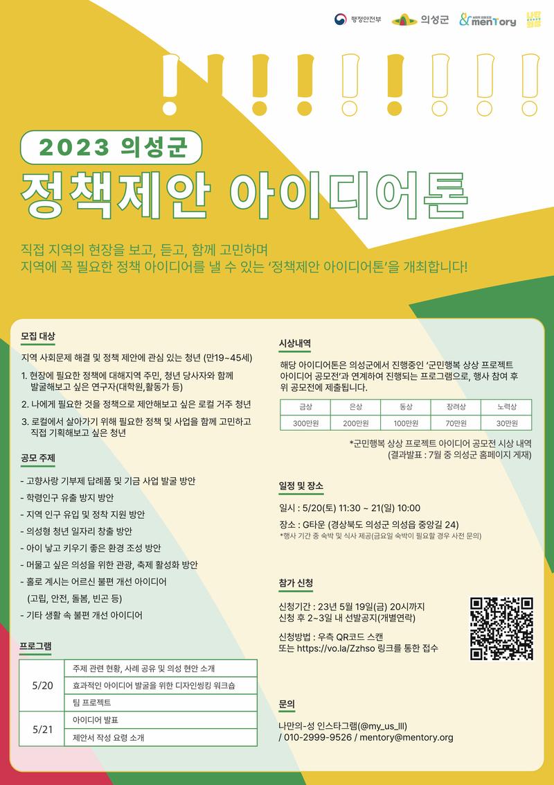 지역문제, 로컬라이프에 관심 있다면, 유의미한 정책 제안을 하고 싶다면, 직접 지역의 현장을 보고, 주민들의 이야기를 듣고, 비슷한 관심사를 가진 동료들과 함께 아이디어를 낼 수 있는 '의성군 정책제안 아이디어톤'에 참여하세요!