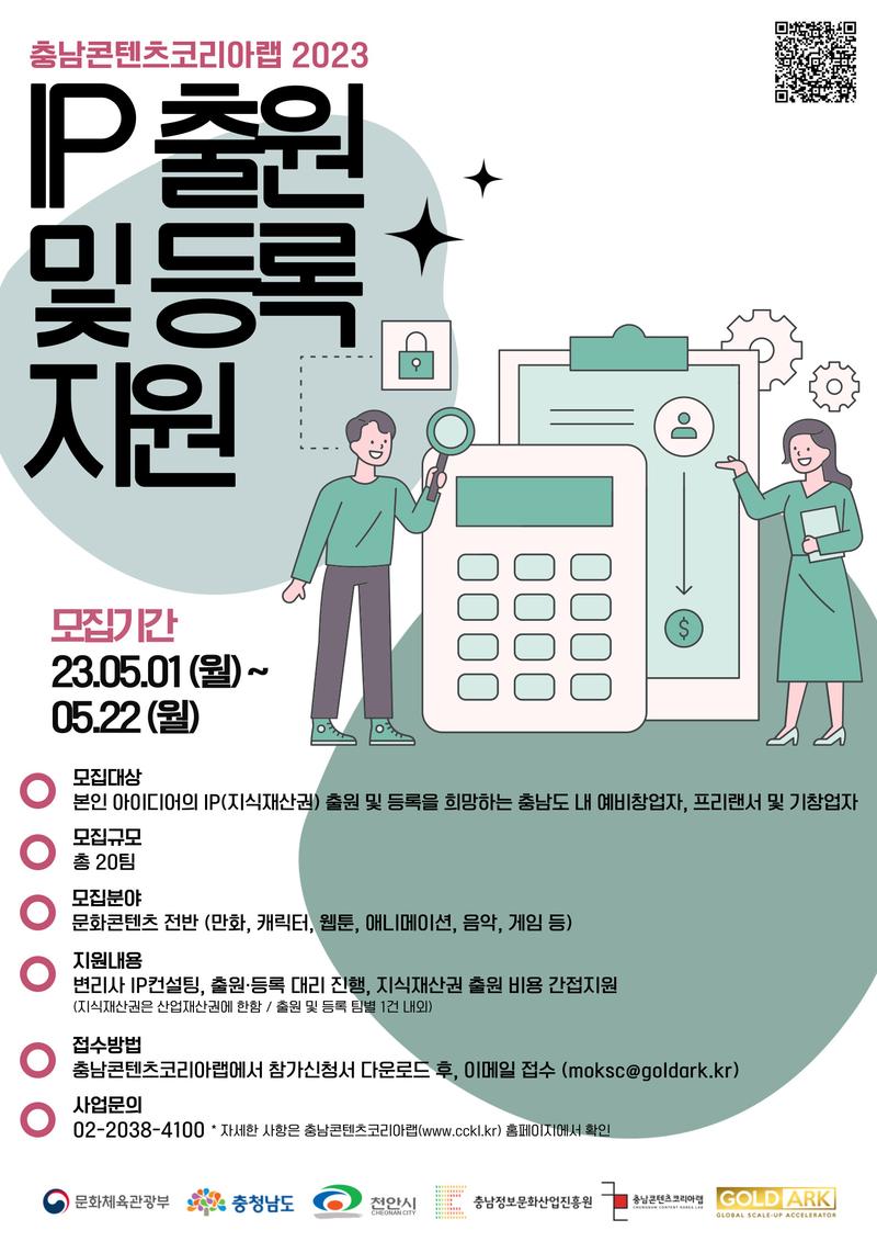 2023 충남콘텐츠코리아랩 콘텐츠 IP 출원 및 등록 지원 참가자 모집공고 ▶모집개요 접수기간 : 2023년 5월 1일(월) \~ 5월 22일(월) 신청자격 : IP(지식재산권) 출원 및 등록을 희망하는 충남도 내 예비창업자, 프리랜서 및 기창업자 모집규모 : 총 20팀 모집분야 : 문화콘텐츠 전반 ※캐릭터, 웹툰, 게임, 애니메이션, 음악, 실감콘텐츠(AR/VR, 홀로그램 등) 등 콘텐츠 상품의 기획, 개발, 제작, 생산, 유통, 서비스 등과 관련된 콘텐츠 분야 ※콘텐츠 장르 간, 순수예술과 첨단기술 간, 콘텐츠와 기술 간 융합에 기반한 새로운 창작과 비즈니스 사업화 분야 ▶지원내용 및 혜택 지원내용 : 변리사 IP 컨설팅, 출원 및 등록 대리 진행 지원혜택 : 지식재산권 출원 비용 간접지원 ※ 지식재산권은 산업재산권에 한하며, 출원 및 등록 팀별 1건 내외 지원 ▶지원방법 충남콘텐츠코리아랩 홈페이지(링크)에서 참가신청서 다운로드 후 이메일 접수(moksc@goldark.kr) ▶사업문의 문의 : 02-2038-4100 / moksc@goldark.kr