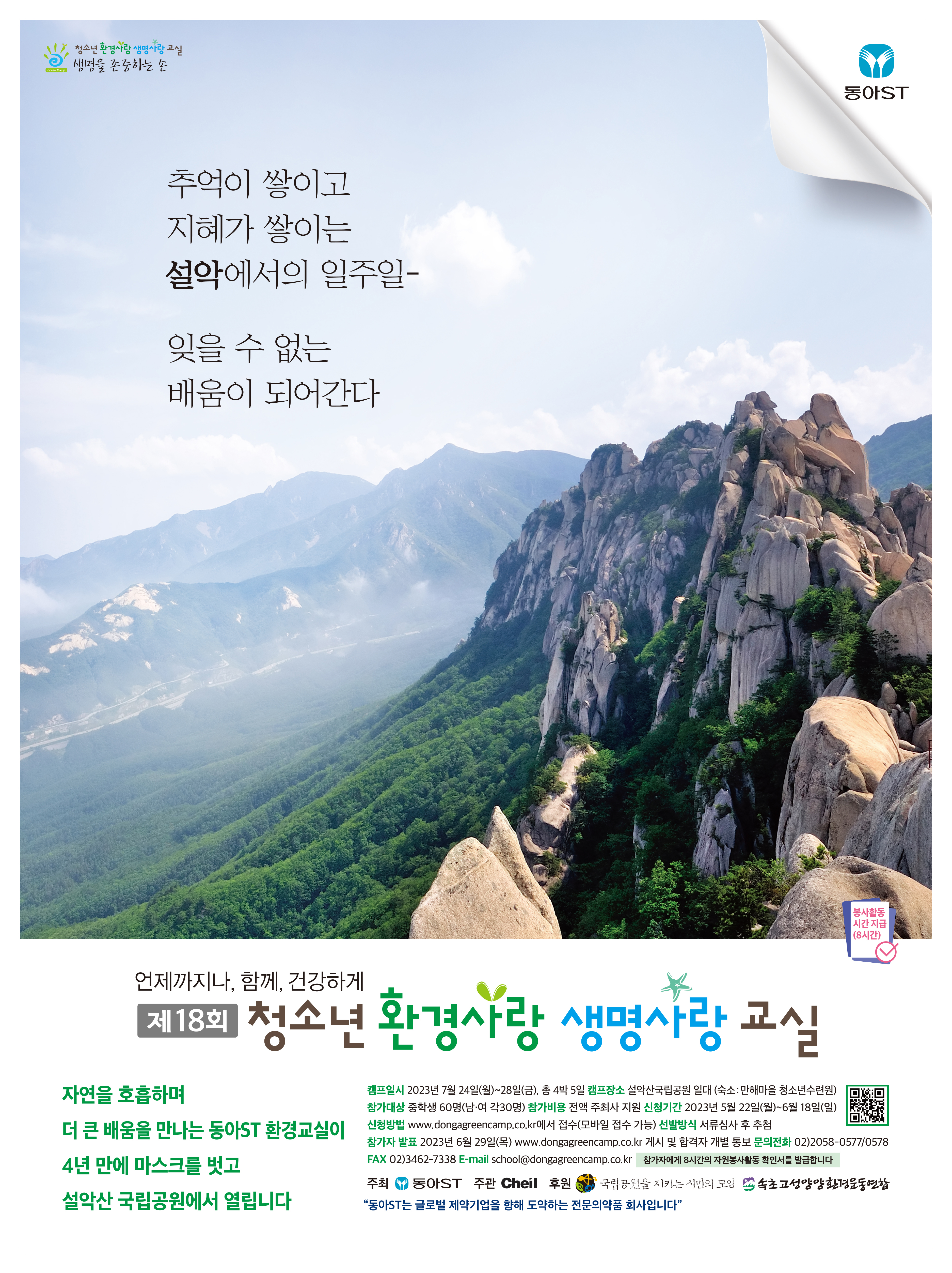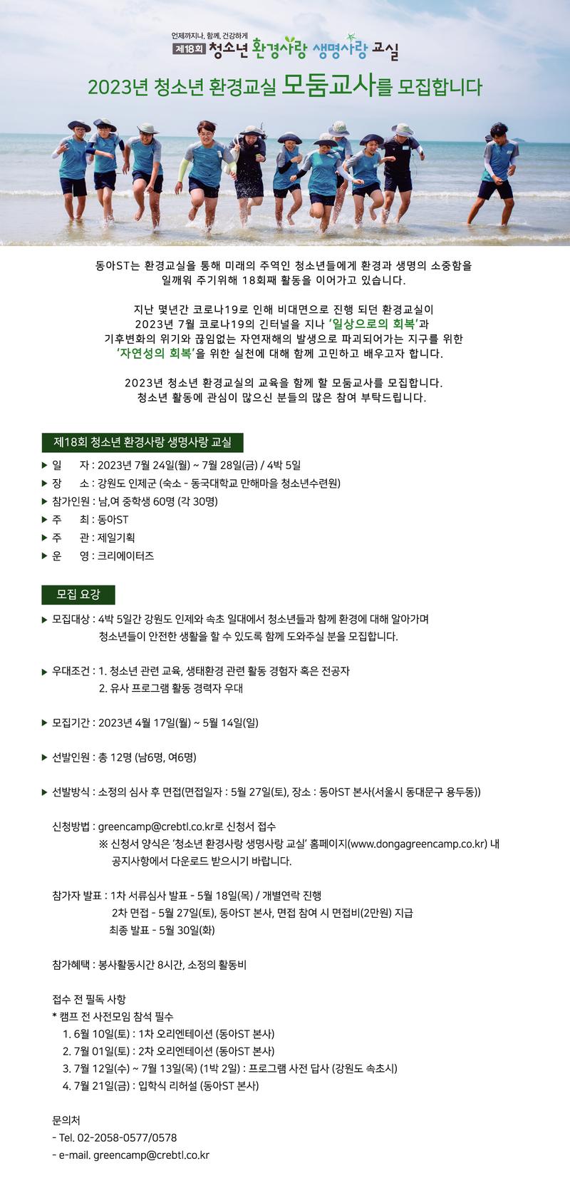 ● 행사 개요 - 행사명 : 제18회 청소년 환경사랑 생명사랑 교실_모둠교사 모집 - 장소 : 강원도 인제군 (숙소 - 동국대학교 만해마을 청소년수련원) - 참가인원 : 전국 남\,여 중학생 60명 (각 30명) - 주최 : 동아ST - 주관 : 제일기획 - 운영 : 크리에이터즈