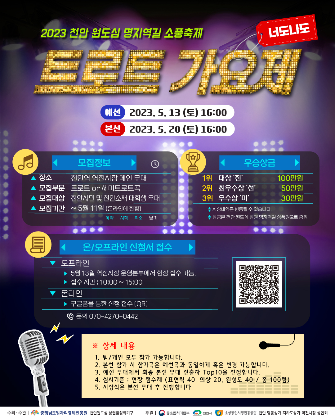 [제 2회 명지역길 소풍축제, 트로트 가요제 참가자 대모집!] - 대회 일정 예선 2023. 5. 13. 토요일 16:00 \~ 본선 2023. 5. 20. 토요일 16:00 \~ *※ 일정은 사정에 따라 변경 될 수 있습니다.