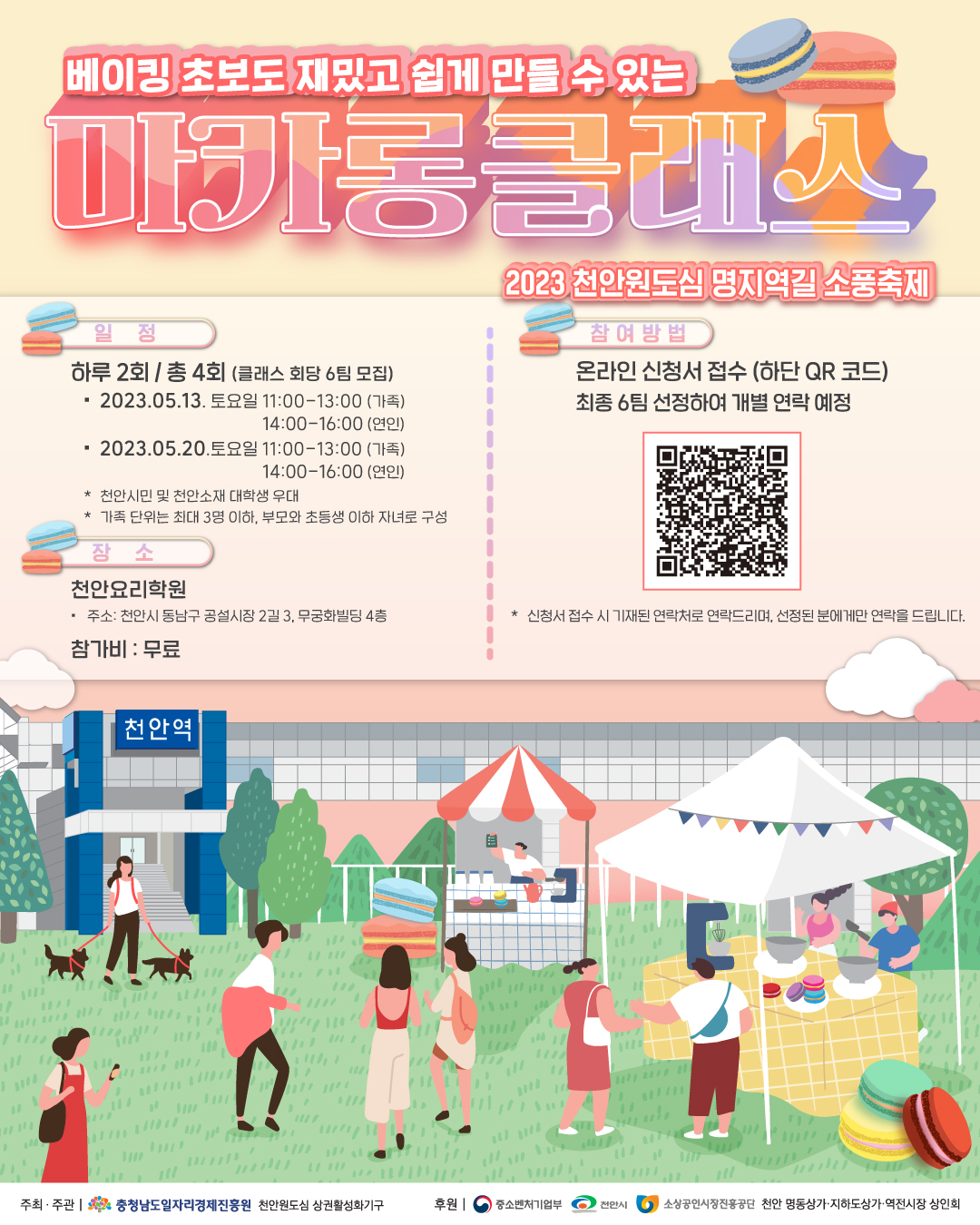 [베이킹 초보도 재밌고 쉽게 만들수 있는 '마카롱 클래스'에 참가할 참가자를 모집합니다.] - 쿠킹 클래스 일정 (하루 2회, 총 4회 수업) * 1회차 - 2023년 5월 13일 토요일 / 오전 11:00 \~ 13:00 (가족 테마) * 2회차 - 2023년 5월 13일 토요일 / 오후 14:00 \~ 16:00 (연인 테마) * 3회차 - 2023년 5월 20일 토요일 / 오전 11:00 \~ 13:00 (가족 테마) * 4회차 - 2023년 5월 20일 토요일 / 오후 14:00\~ 16:00 (연인 테마) - 참가비 : 무료 - 쿠킹 클래스 장소 : 천안요리학원 (천안시 동남구 공설시장 2길3 무궁화 빌딩 4층) ------------------------------------------------------------------ 응모자격 - 참여 가능 대상 가족 테마 : 가족 단위 2\~3인, 부모와 초등생이하의 자녀로 구성된 팀이면 참여가능 연인 테마 : 연인 2인, 참여 가능 ------------------------------------------------------------------ 시상내역 삭제 ------------------------------------------------------------------ 접수방법 * 온라인 구글폼을 통한 신청 접수 (QR) 온라인 신청서 접수 (구글폼) - 선착순 지원 선발 (테마에 맞지 않는 지원자일 경우 쿠킹 클래스 참여가 어려울 수 있습니다.) ------------------------------------------------------------------ 접수기간 * 접수 마감 : \~5월 11일 목요일 18시 까지 * 쿠킹클래스 참가자 발표 : 5월 12일 금요일 (개별연락) / 회차 당 6팀 ------------------------------------------------------------------ 문의처 문의전화 : 070-4270-0442