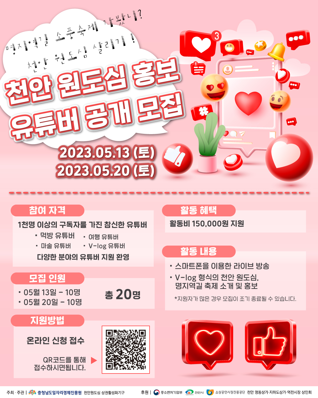 [제 2 명지역길 소풍 축제 활동 유튜버 모집!] 명지역길 소풍축제라고 들어 봤어?? 천안 원도심 살리기 프로젝트! 명지역길 소풍 축제! 천안 원도심을 함께 알릴 유튜버를 공개 모집합니다.!!! 행사 일시 : 2023. 5. 13 (토) / 5. 20 (토) 모집인원 13일 - 10명 20일 - 10명 활동내용 1. 스마트폰을 이용한 라이브 방송 2. Vlog 형식의 천안 원도심, 명지역길 축제 소개 및 홍보 ------------------------------------------------------------------ 응모자격 지원자격 : 천명 이상의 구독자를 가진 참신한 유튜버 ------------------------------------------------------------------ 시상내역 활동혜택 : 활동비 150,000원 지원 ------------------------------------------------------------------ 접수방법 지원방법 : 온라인 신청서 접수 (구글폼) 지원자격에 맞는 유튜버 선착순 지원 ------------------------------------------------------------------ 접수기간 * 접수 마감 : \~5월 11일 목요일 18시 까지 * 지원자가 많은 경우 모집이 조기 종료될 수 있습니다. * 활동유튜버 발표 : 5월 12일 금요일 (개별연락) 20인 ------------------------------------------------------------------ 문의처 문의전화 : 070-4270-0442