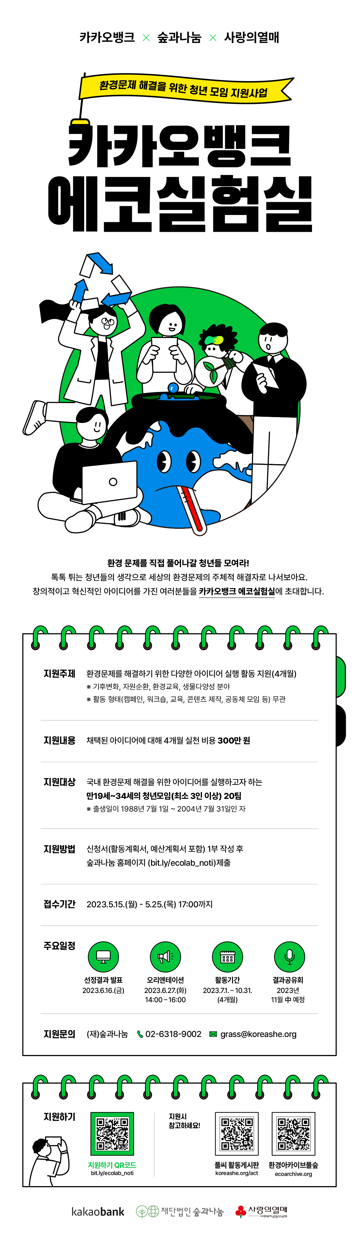 1. 지원주제 - 환경문제를 해결하기 위한 다양한 아이디어 실행 활동 지원(4개월) ※ 기후변화, 자원순환, 환경교육, 생물다양성 분야 ※ 활동 형태(캠페인, 워크숍, 교육, 콘텐츠 제작, 공동체 모임 등) 무관