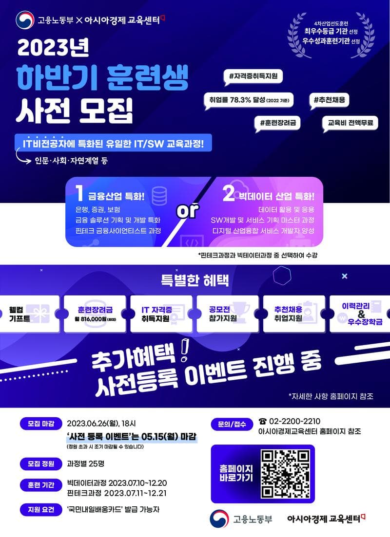 ◆ 활동 기간 : 빅데이터 2023.07.10\~12.20 (900시간) / 핀테크 과정 2023.07.11\~12.21(900시간) ** 주 5회(평일), 오전 9:00 \~ 오후 6:00, (법정공유일 휴관)