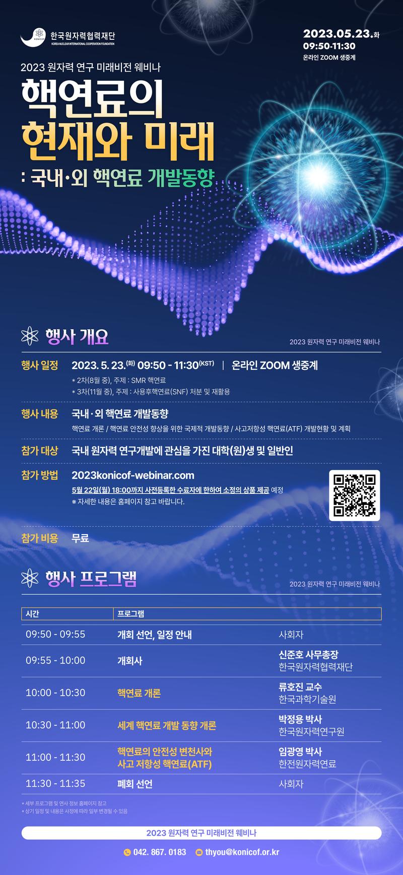 안녕하십니까, 한국원자력협력재단입니다. 우리 재단에서 "2023년 원자력 연구 미래비전 웨비나"를 5월 23일(화)에 개최합니다. 한국원자력협력재단에서는 세계적인 연구개발 추세를 소개하고 원자력 R&D의 긍정적 미래비전을 제시하기 위해 원자력 미래비전 세미나를 진행하고 있습니다. 올해는 "핵연료의 현재와 미래"라는 주제로 3차례(5월, 8월, 11월)에 걸쳐 웨비나 시리즈를 진행합니다. 첫번째 웨비나의 세부주제는 "국내외 핵연료 개발동향" 이며, 5월 23일(화) (9:50\~11:30)에 줌(ZOOM)을 통해 참여가능합니다. 원자력에 관심 있는 대학(원)생 및 선진연구자에게 좋은 경험이 될 수 있는 기회이니, 많은 참여 부탁드립니다. ('사전 등록 이벤트' 바로가기 클릭) ('유튜브 티저 영상' 바로가기 클릭) 자세한 내용은 첨부된 포스터에서 확인바랍니다. 감사합니다.