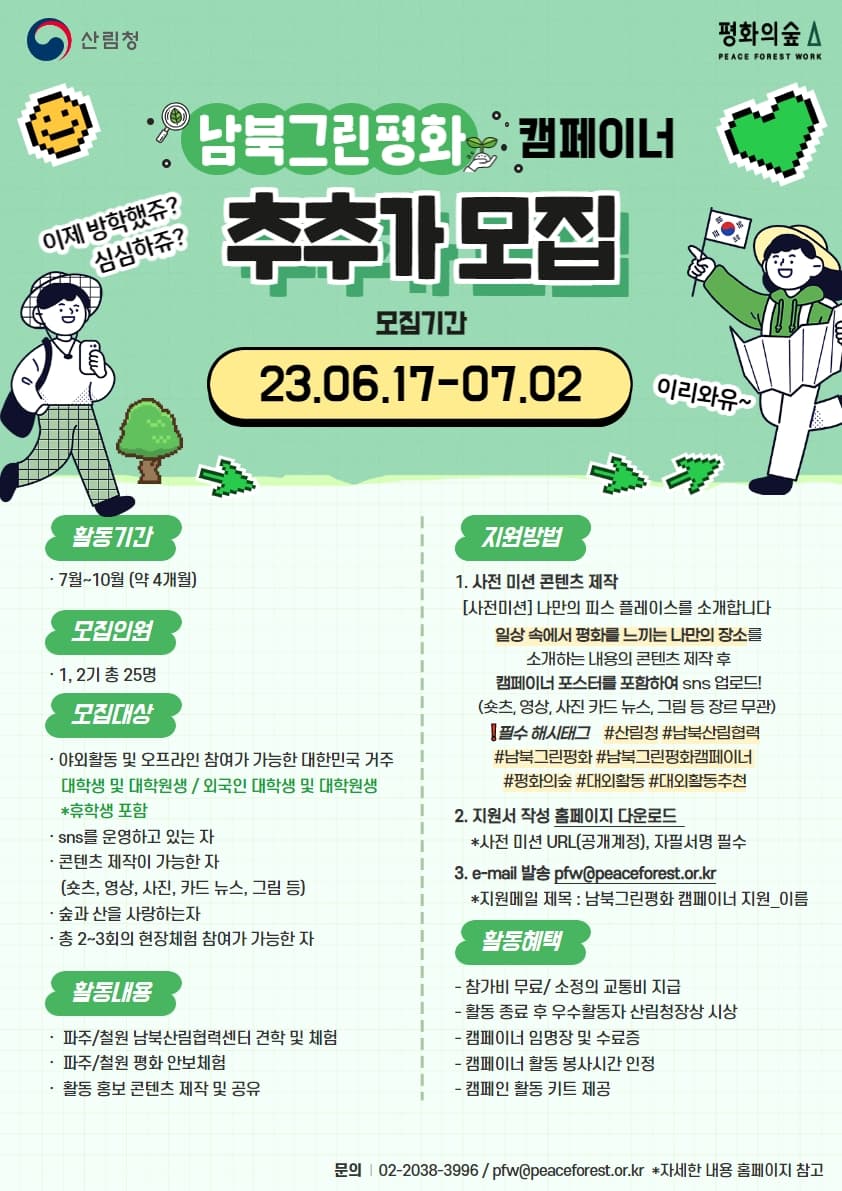 🌳2023년 산림청 남북그린평화 캠페이너를 추가모집합니다!(\~7/2)