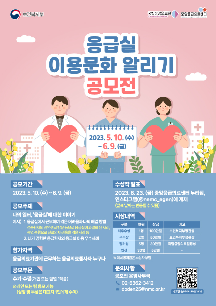 ○ 공모개요 - 중앙응급의료센터는 응급실 이용문화 알리기 캠페인의 일환으로, 응급실 근무자 대상 '나의 일터, 응급실 이야기' 공모전을 개최하오니 많은 참여와 관심 부탁드립니다.