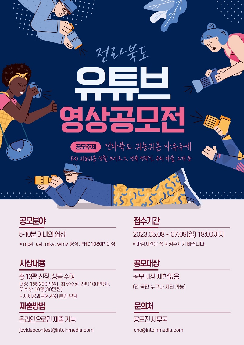 ■ 응모주제 전라북도 귀농귀촌과 관련한 자유주제 - 귀농귀촌 생활 브이로그\, 전라북도 정착기\, 우리 마을 소개 등 * 배경이나 내용에 전라북도가 노출되어야 함 ■ 응모자격 - 응모대상 제한없음(전 국민 누구나) ■ 응모일정 - 응모일정 : 2023년 5월 8일(월)\~7월 9일(일)/ 18시까지 - 결과발표 : 2023년 7월 말 예정(홈페이지 및 개별연락) - 시상식 : 2023년 7월 말 예정 ■ 접수방법 - 이메일 제출(jbvideocontest@intoinmedia.com) * 공모전 신청서 첨부(필수) * 고향사랑기부제 기부내역 증빙자료(선택사항) ■ 제출규격 - 분량 : 5분 이상 10분 이내 길이의 영상 - 형식 : mp4\, avi\, mkv\, wmv - 해상도 : FHD1080P 이상 ■ 시상내역 - 대상 1명(200만원) - 최우수상 2명(100만원) - 우수상 10명(30만원) ※ 제세공과금(4.4%) 본인 부담 *수상작 활용 - 전라북도 귀농귀촌 유튜브 채널에 업로드 및 영상 광고 집행 / 로고 및 수상 안내 문구 삽입 등의 2차 가공 예정 ■ 문의처 공모전 사무국 cho@intoinmedia.com - 전라북도 농어촌종합지원센터 귀농귀촌부 1577-3742 - 평일 09:00\~18:00 운영(주말 및 공휴일 제외) ※ 유의사항은 공고문 참고