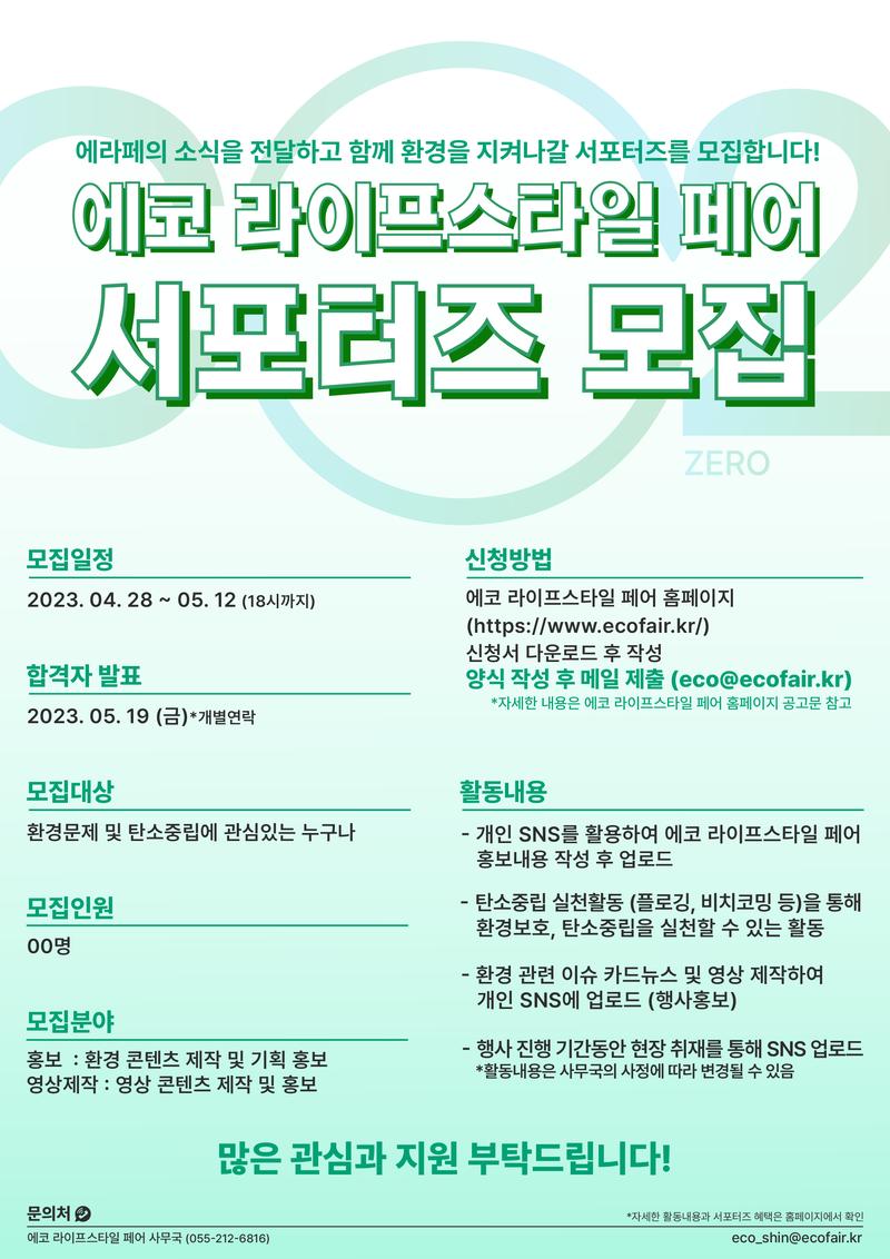 ◎ 접수방법 - 신청기간 : 2023년 4월 28일 \~ 2023년 5월 12일 18시까지 - 신청방법 : 에코 라이프스타일 페어 홈페이지(https://www.ecofair.kr/)) 방문 후 - 신청서 다운로드 후 작성 ※문서명: 성명_에코서포터즈_신청일자 형태 제출 - 발 표 : 2023년 5월 19일 / 선정자 개별 연락 ◎ 서포터즈 혜택 - 서포터즈 활동비 지급 (활동 미션 수행 완료자에 한함) - 서포터즈 활동 증명서 제공 ◎ 유의사항 - 활동 내용에 대한 작품은 사무국이 홍보와 마케팅 목적으로 활용 할 수 있으며, 목적의 범위 안에서 전체나 일부를 변형하고나 재편집 또는 가공할 수 있음 - 서포터즈는 소유권, 저작권, 초상권, 지적 재산권 등 기타 제반 권리를 침해하지 않도록 주의 의무를 다해야하며, 향후 분쟁 발생에 따른 법적인 책임은 서포터즈에게 있음 - 제출 서류상의 기재 착오나 개인정보 오기, 연락 불능으로 인한 불이익은 지원자의 책임으로 간주 - 서포터즈의 콘텐츠에 대한 표절 및 모방 등 각종 법적인 문제가 발생 시 모든 책임은 본인에게 있음 ◎ 문의처 - 담당자 : 에코 라이프스타일 페어 사무국 (055-212-6816) - 이메일 : eco_shin@ecofair.kr