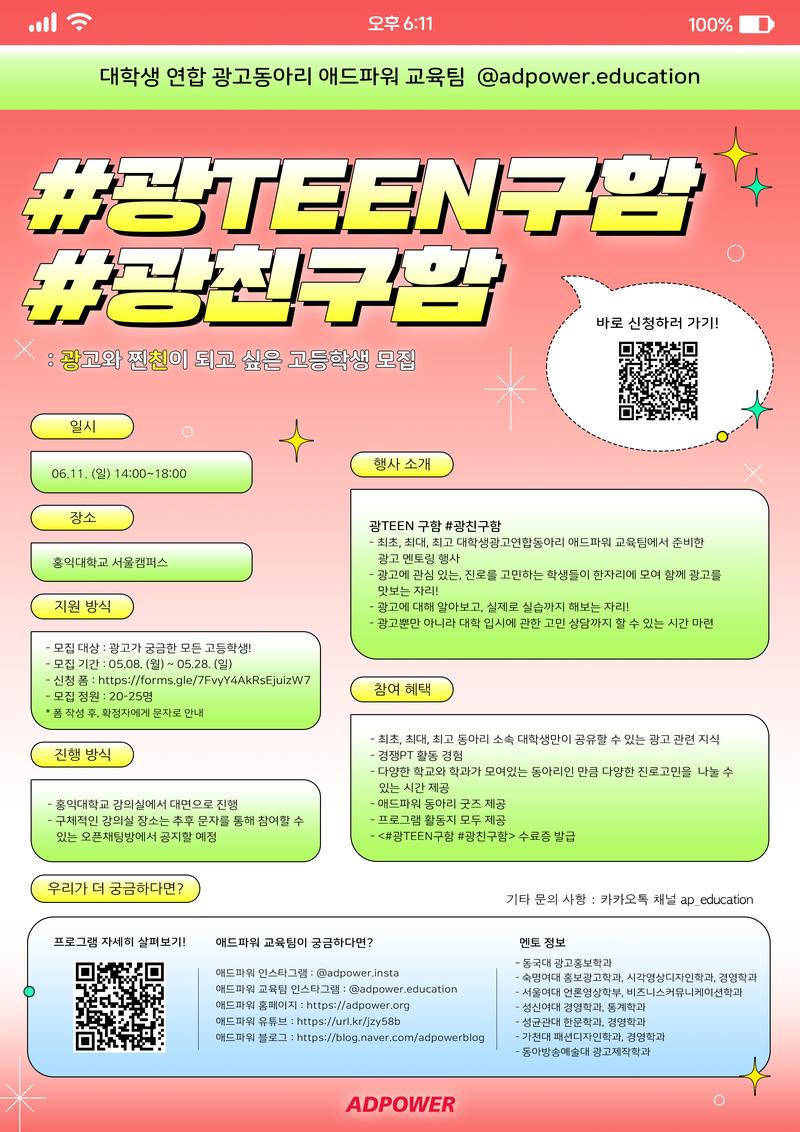 안녕하세요. 최초, 최대, 최고 대학생 광고연합동아리 ‘애드파워’ 68대 교육팀입니다. 2023년 6월 11일, 광고에 관심 있는 고등학생을 대상으로 멘토링 행사를 진행합니다!