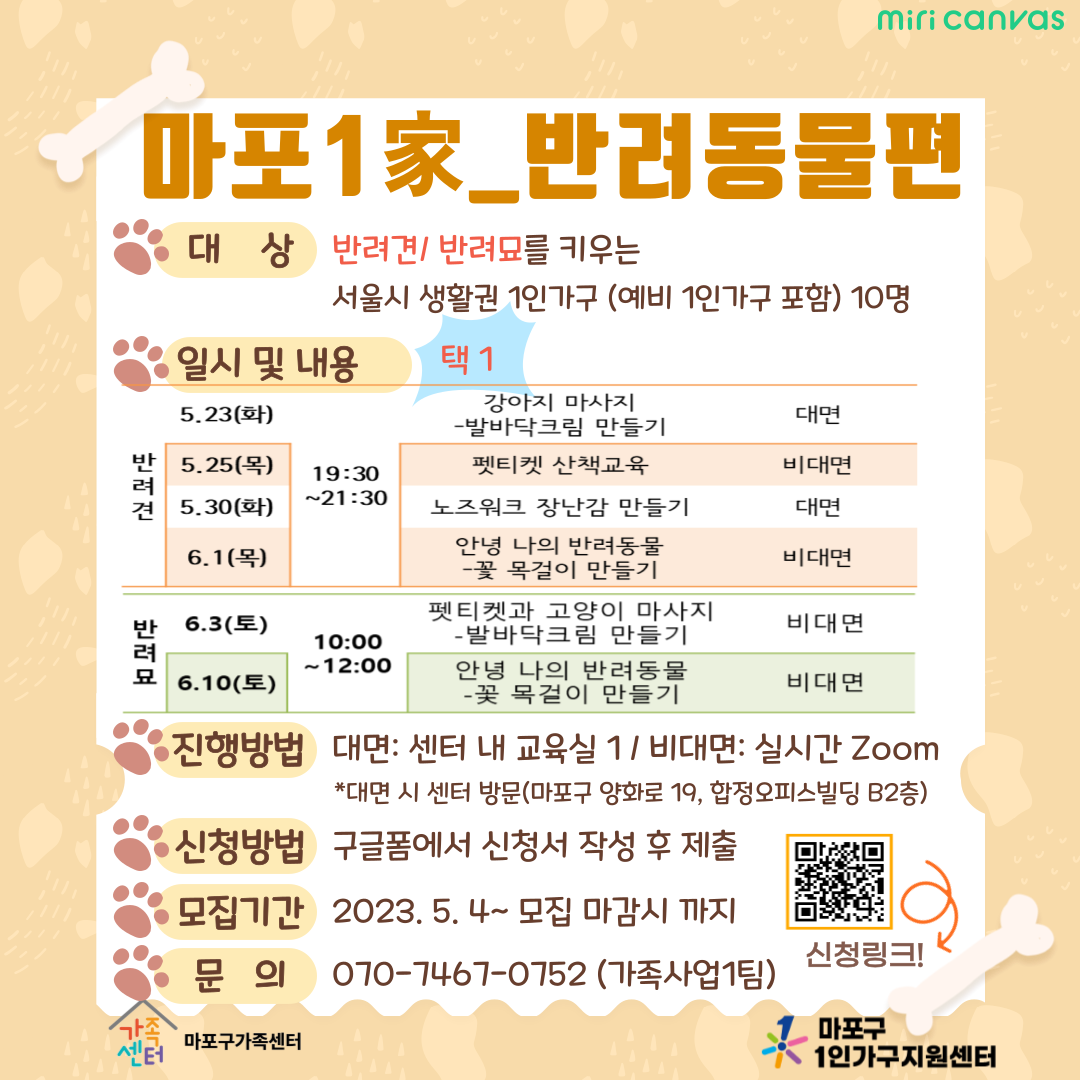[마포 1家_반려동물편] ‘나의 반려견을 부탁해’ 프로그램이 올해 ‘마포1家_반려동물편’으로 돌아왔습니다. (마포1家는 마포구1인가구지원사업의 새로운 명칭입니다.) 반려견과 반려묘 교육 일정이 상이하니 꼭! 홍보지 확인해주세요\~ 1. 대상: 반려견/반려묘를 키우는 서울시 생활권 1인가구(예비1인가구 포함) 2. 신청기간: 5.8\~모집 완료 시 까지 3. 일시 및 내용 : 5월 23일\~6월 1일(매주 화, 목) 19:30\~21:30 반려견 교육 및 활동 총 4회기 6월 3일\~6월 10일(매주 토) 10:00\~12:00 반려묘 교육 및 활동 총 2회기 4. 신청방법: 구글폼에서 신청서 작성 후 제출 (반려견과 반려묘 중 택 1하여 신청) https://forms.gle/WthiUeJpvmaT2rBq6 5. 문의:070-7467-0752 (가족사업 1팀)