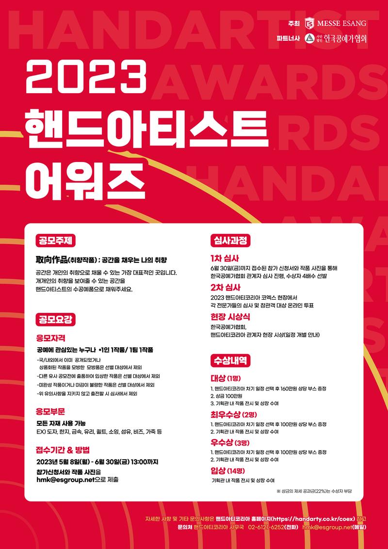 최우수상(2명) 1. 핸드아티코리아 차기 일정 선택 후 100만원 상당 부스 증정 2.기획관 내 작품 전시 및 상장 수여