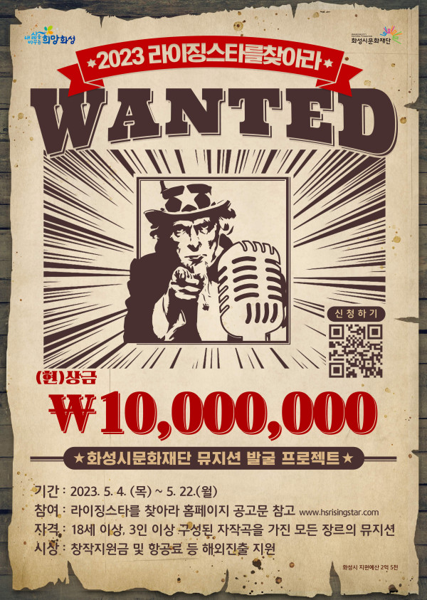 ■ 주제 화성시문화재단(대표이사 김신아)이 주최하는 전국 밴드 경연대회 ‘2023 라이징스타를 찾아라’가 5월 4일(목) 참가자 모집을 시작으로 대장정의 막을 올렸다. 올해로 6회를 맞는 '라이징스타를 찾아라'의 역대 수상 팀들은 음원 발매와 각종 방송 활동 등 활발한 행보를 보이고 있어 밴드 단체 사이에서는 꿈의 무대로 자리 잡고 있다. 올해 라이징스타를 찾아라는 총상금 1,000만 원과 우승팀에 대한 다양한 특전을 준비했으며 △서울뮤직위크 초청공연 △해외진출 항공료 지원 △해외 진출 포트폴리오, 방송송출, 콘텐츠 제작 및 홍보 마케팅 지원 등 뮤지션이라면 누구나 꿈꾸는 많은 혜택을 제공할 예정이다.