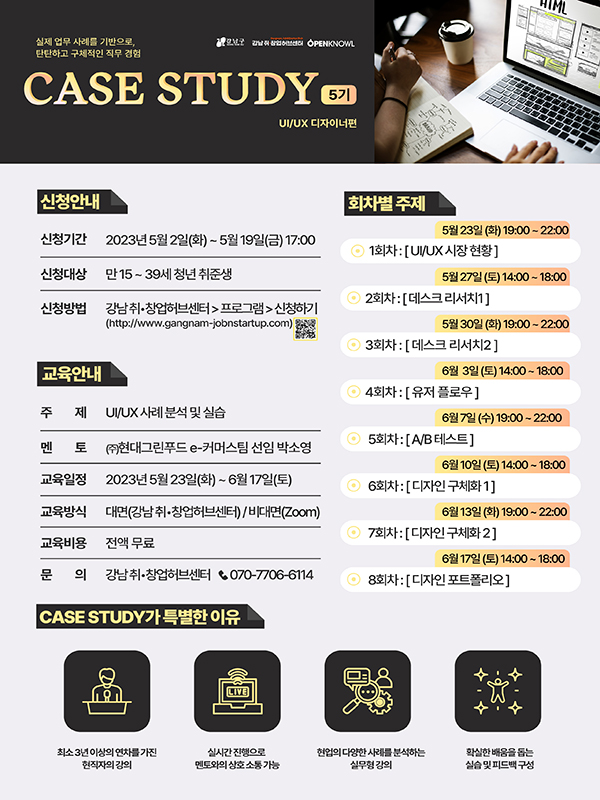 🟧 주 제 : UI/UX 사례 분석 및 실습 🟧 멘 토 : ㈜현대그린푸드 상품본부 e-커머스팀 선임 박소영 🟧 교육일시 : 2023년 5월 23일(화) \~ 6월 17일(토) 🟧 교육대상 : 만 15세\~39세 청년 취준생 30명 🟧 교육장소 : 대면 (서울특별시 강남구 역삼로160, 강남 취•창업허브센터) 비대면 (ZOOM) 🟧 교육내용 : 05/23(화) 19:00\~22:00 UI/UX 시장 현황 05/27(토) 14:00\~18:00 데스크 리서치 1 05/30(화) 19:00\~22:00 데스크 리서치 2 06/03(토) 14:00\~18:00 유저 플로우 06/07(수) 19:00\~22:00 A/B 테스트 06/10(토) 14:00\~18:00 디자인 구체화1 06/13(화) 19:00\~22:00 디자인 구체화2 06/17(토) 14:00\~18:00 디자인 포트폴리오 🟧 교육비용 : 전액 무료 (정가 20만원)