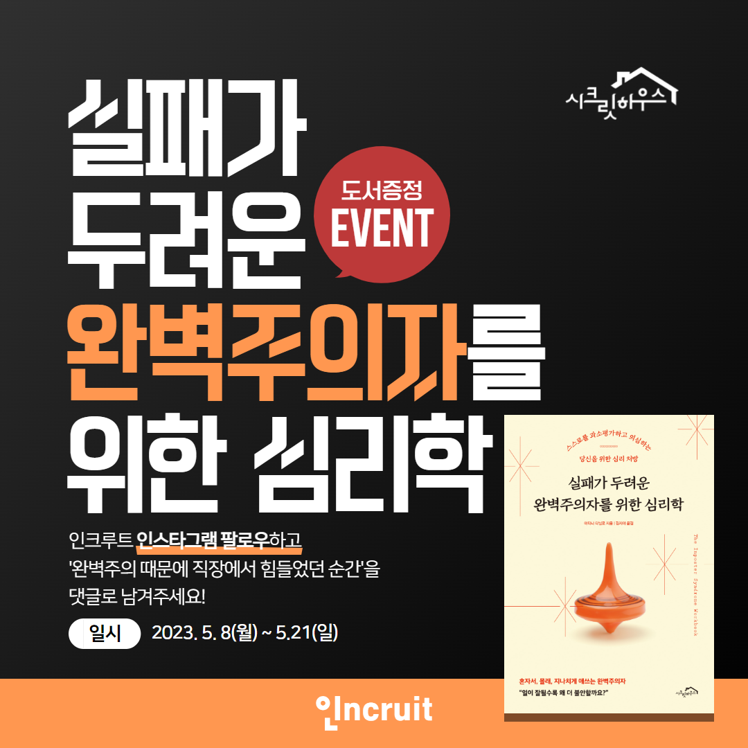인크루트와 시크릿하우스가 친구들의 멘탈 케어를 위해 총 10명에게 🎉도서 '실패가 두려운 완벽주의자를 위한 심리학' 1권을 증정합니다🎉