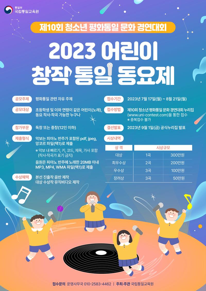 ☐ 공모명 - 2023년 어린이 창작 통일 동요제 ☐ 공모주제 - 평화통일 관련 자유 주제 ☐ 접수기간 -2023.7.17.(월) \~ 2023.8.21.(월) ☐ 공모부문 - 독창 또는 중창(12인 이하) ☐ 공모자격 - 초등학생 및 이와 연령이 같은 어린이(노래)\, 동요 작사·작곡 가능한 누구나 ☐ 작품형식 - 악보 : 피아노 반주가 포함된 pdf\, jpeg 또는 앙코르 파일(택1)로 제출 △악보 내 빠르기, 키, 코드 포함 △제목·가사 포함 △작사·작곡가 표기금지 - 노래음원 : 피아노 반주에 노래한 20MB이내 MP3\, MP4\, WMA 파일(택1)로 제출 ☐ 접수방법 - 제10회 청소년 평화통일 문화 경연대회 누리집(http://www.uni-contest.com) 접수 ① 참가신청 : 누리집(어린이 창작 통일 동요제 탭) ② 접수하러 가기 ③ 참가신청서 작성 ④ 제출서류(악보 및 노래음원, 개인정보 제공 및 수집·이용 동의서) 업로드 ⑤ 접수확인 * 제출서류 : 개인정보 제공 및 수집·이용 동의서(본인 및 법정대리인)는 자필 서명 후 스캔 또는 촬영하여 파일로 업로드 ☐ 심사방법 - 온라인 국민투표 : 2023. 9. 8(금) \~ 9. 17(일) * 예선심사를 통과한 결선진출 9곡 작품 대상으로 1인 3표 온라인 국민투표 실시 * 국민투표 방법 등은 9. 6(수) 누리집에 공지 ☐ 시상 - 시상내역: 총 9곡 (1\,150만원) o 대상: 1곡 300만원 o 최우수상: 2곡 각 200만원 o 우수상: 3곡 각 100만원o 장려상: 3곡 각 50만원 * 상금 및 통일부장관상 수여 - 수상 혜택 o 본선 진출작 앨범 제작·배포 및 주요 음원사이트 음원 등록 o 대상 수상작 뮤직비디오 제작(10월중) ☐ SNS 채널 🟢 제10회 청소년 평화통일 문화 경연대회 누리집 : https://bit.ly/3VGIgew 🟠 수상작 영상 보러가기 : https://bit.ly/3B28RsP 🟢 인스타그램 채널 : https://bit.ly/41ffHWA ☐ 유의사항 및 공지사항 - 공식 누리집 공모요강 참고 (http://www.uni-contest.com) ☐ 문의 - 카카오톡 실시간 상담(http://pf.kakao.com/_DtxcDxj/chat) * 평일 10:00\~18:00 (공휴일 및 휴일 제외)