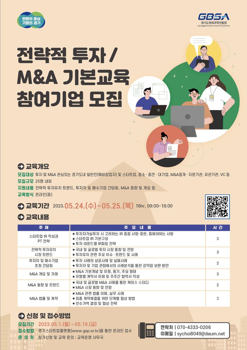 | 구 분 | 제출물 내역 | 제출형식 | | --- | ------ | ---- | | 참가신청서 | 전략적 투자/ M&A 교육 참가신청서(사업자등록증 포함) | PDF | | 개인정보 수집 및 이용 동의서 | 개인정보 수집 및 이용 동의서(날인 후 스캔) | PDF |