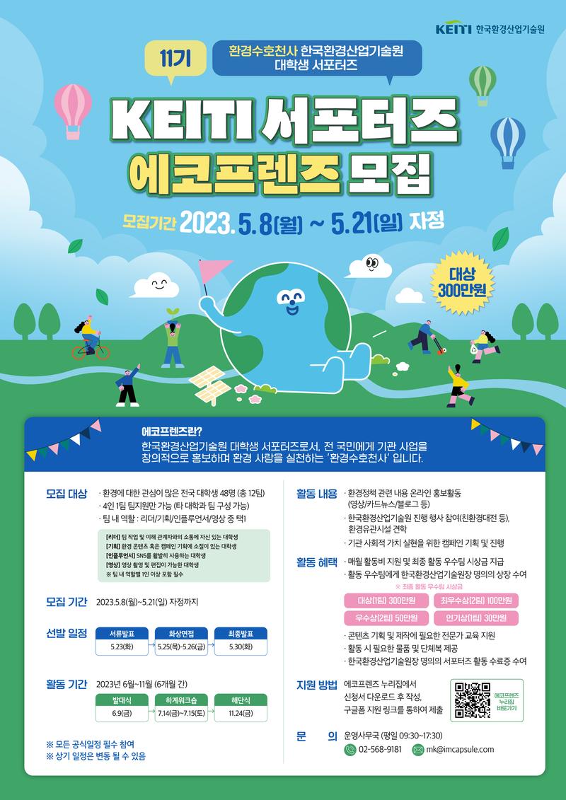 제11기 KEITI 서포터즈 에코프렌즈 모집 ▶ 에코프렌즈란? 한국환경산업기술원 대학생 서포터즈로서, 전 국민에게 기관 사업을 창의적으로 홍보하며 환경 사랑을 실천하는 ‘환경수호천사’입니다. ▶ 모집기간 : 2023년 5월 8일(월) \~ 5월 21일(일) 자정 전까지 접수 ▶ 모집대상 - 환경에 대한 관심이 많은 전국 대학생 48명 (총 12팀) - 4인 1팀 팀지원만 가능 (타 대학과 팀 구성 가능) - 팀 내 역할 : 리더/기획/영상/인플루언서 중 택1 [리더] 팀 작업 및 이해 관계자와의 소통에 자신이 있는 대학생 [기획] 환경 콘텐츠 혹은 캠페인 기획에 소질이 있는 대학생 [인플루언서] SNS를 활발히 사용하는 대학생 [영상] 영상 촬영 및 편집이 가능한 대학생 ※팀 내 담당 역할 1개씩 포함 필수 ※리더는 기획, 인플루언서, 영상 중 역할을 1개 더 추가 담당 ▶ 활동기간 : 2023년 6월 \~ 11월 (6개월) - 발대식 : 6월 9일(금) - 하계워크숍 : 7월 14일(금) \~ 7월 15일(토) - 해단식 : 11월 24일(금) ※상기 일정은 변동될 수 있습니다. 자세한 일정은 선발 이후 공지해 드릴 예정입니다. ※모든 공식 일정에 필참, 미참석 시 활동에 제한이 있을 수 있습니다. ▶ 활동내용 1) 온라인 홍보활동 - 환경정책 및 행사관련 온라인 콘텐츠 제작 및 홍보(영상/카드뉴스/블로그 등) 2) 오프라인 홍보활동 - 한국환경산업기술원 진행 행사 참여(친환경대전 등) - 홍보부스 운영, 길거리 캠페인, 설문조사 등 오프라인 행사 기획 및 운영 - 그 외 환경 보호 관련 외부 활동 3) 환경 교육 및 소통활동 - 환경 교육 프로그램 개발 및 방문 강연 - 환경 유관기관 견학, 기관 사회적 가치 실현을 위한 활동 ▶ 활동혜택 - 매월 활동비 지원 및 최종 우수 활동팀 시상금 지급 - 우수 활동팀에게 한국환경산업기술원장 명의의 상장 수여 - 한국환경산업기술원 진행 행사 참여 및 환경유관시설 견학 기회 제공 - 콘텐츠 기획 및 제작에 필요한 교육 지원 - 활동 시 필요한 물품 및 단체복 제공 - 한국환경산업기술원장 명의의 서포터즈 활동 수료증 수여 ▶ 최종 활동 우수팀 시상금 지급 - 대상 : 300만원(1팀) - 최우수상 : 100만원(2팀) - 우수상 : 50만원(2팀) - 인기상 : 30만원(1팀) ▶ 선발일정 - 서류발표 : 5월 23일(화) - 화상면접 : 5월 25일(목) \~ 5월 26일(금) - 최종발표 : 5월 30일(화) ※합격팀에 한해 개별 연락드릴 예정입니다. ▶ 지원방법 1. 에코프렌즈 누리집 (http://keiti.re.kr/site/eco/main.do)에서 지원서 다운로드 2. 지원서 작성 후 구글폼 지원 링크(https://forms.gle/Ftde8D6qnMr19a8F8)를 통하여 지원서 접수 - 지원서 파일명 양식 : 제출일_팀명_팀장이름 ※ 예시 : 230508_에코핑크_김에코 - 선택사항 : 01. 팀 소개 영상(팀을 잘 표현할 수 있는 영상) ‧ 형식 : 1분 이내의 자율형식 영상 ‧ 유튜브 업로드 후, 지원링크 내에 URL 기입 02. 기타 포트폴리오 ‧ 파일명 : 제출일_팀명_팀장이름_포폴 ※ 예시 : 230508_에코핑크_김에코_포폴 ‧ 지원링크 내에 PDF 파일 제출 03. 영상 포트폴리오 ‧ 유튜브 업로드 후, 지원링크 내에 URL 기입 ※선택사항은 지원서 외 기타 강점 요소를 추가로 어필하고 싶은 팀은 추가 제출 바랍니다. ※제출 시 유의사항 : 저작권 및 초상권이 모두 해결된 배경음악, 이미지, 사진 활용 등