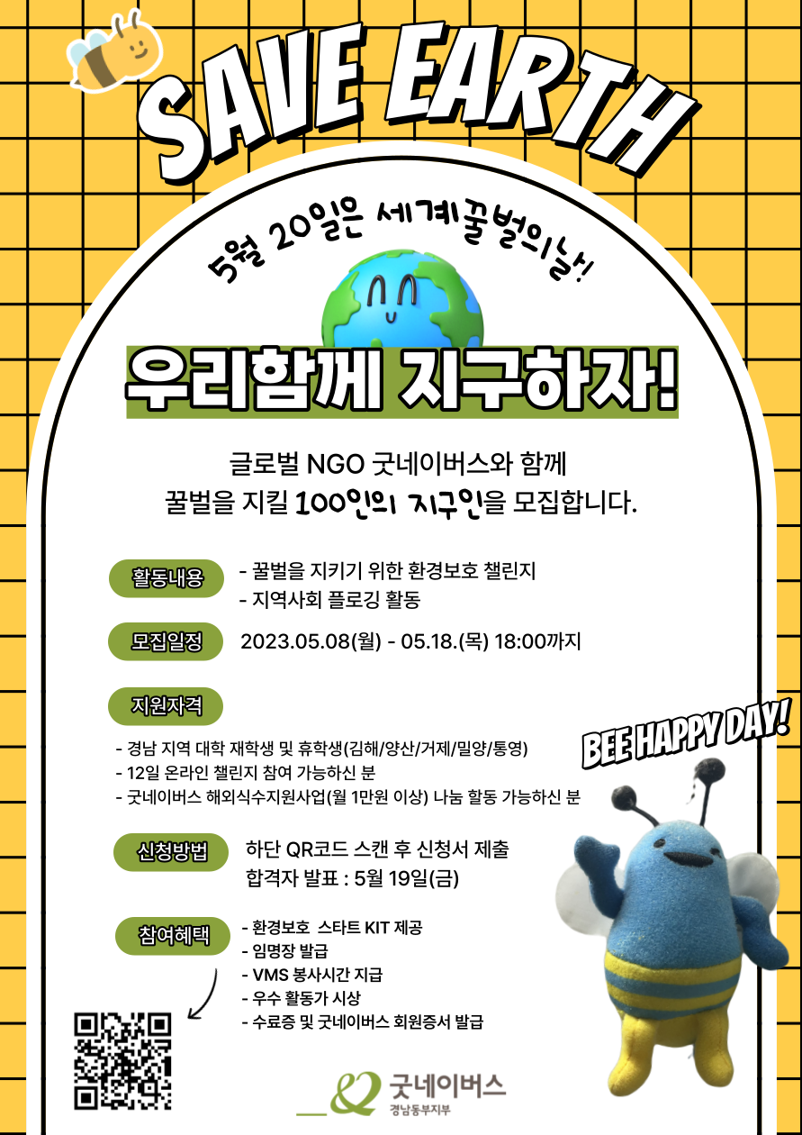 글로벌 NGO 굿네이버스에서 위기에 처한 꿀벌을 구하기 위한 100인의 지구인을 모집합니다! 굿네이버스와 함께 꿀벌을 구할 분들의 많은 신청바랍니다:)