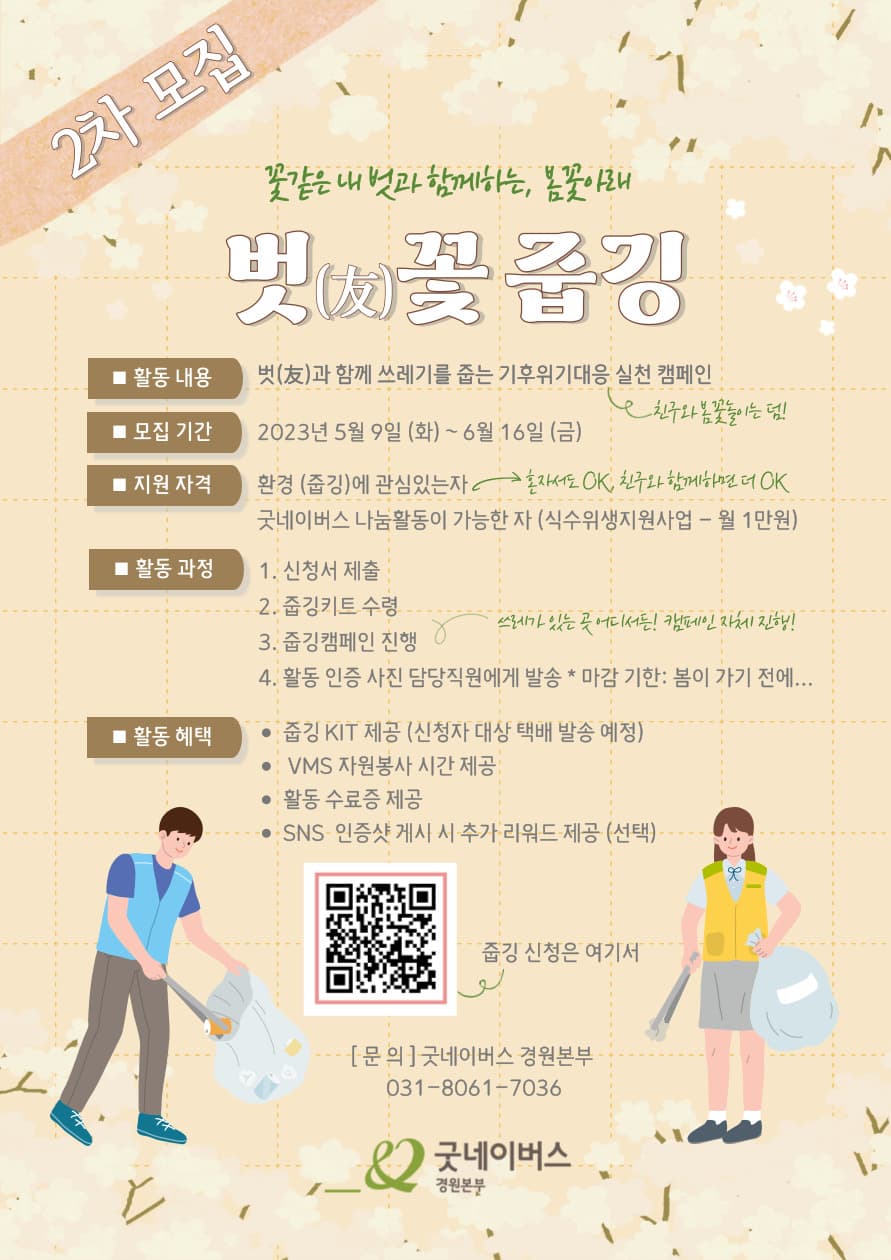 봄꽃을 만끽하면서 환경보호 실천도 하는 굿네이버스 활동이 있다는데... 굿네이버스 줍깅키트, 봉사시간, 수료증 그리고 이벤트까지 참여하면 리워드까지? ※ 주의 ※ 벛꽃 줍는거 아닙니다 X 벚꽃이 있는 곳에서만 해야하는거 아닙니다 X 꼭! 친구랑 둘이서 해야하는거 아닙니다. (둘이하면 더 좋고♡) 자세한 활동 과정은 아래 굿네이버스 경원본부 공식 블로그로!! https://blog.naver.com/ggcenter1