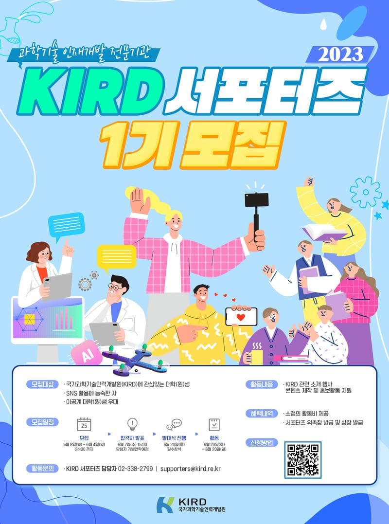 KIRD에서는 기관의 다양한 프로그램에 대한 정보를 대중에게 확산하는 것을 목적으로 'KIRD 서포터즈'를 운영할 계획입니다.