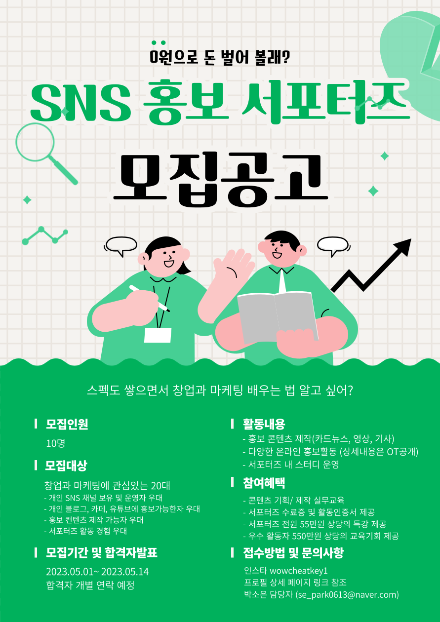 🌱 모집 대상 - 취.창업과 마케팅에 관심있는 전국 20대 <우대사항> - 개인 SNS 채널 보유 및 운영자 우대 - 블로그\, 카페\, 유튜브에 홍보가능한 자 우대 - 포토샵\, 영상 편집 등 홍보 컨텐츠 제작 가능자 우대 - 서포터즈 활동 경험자 우대