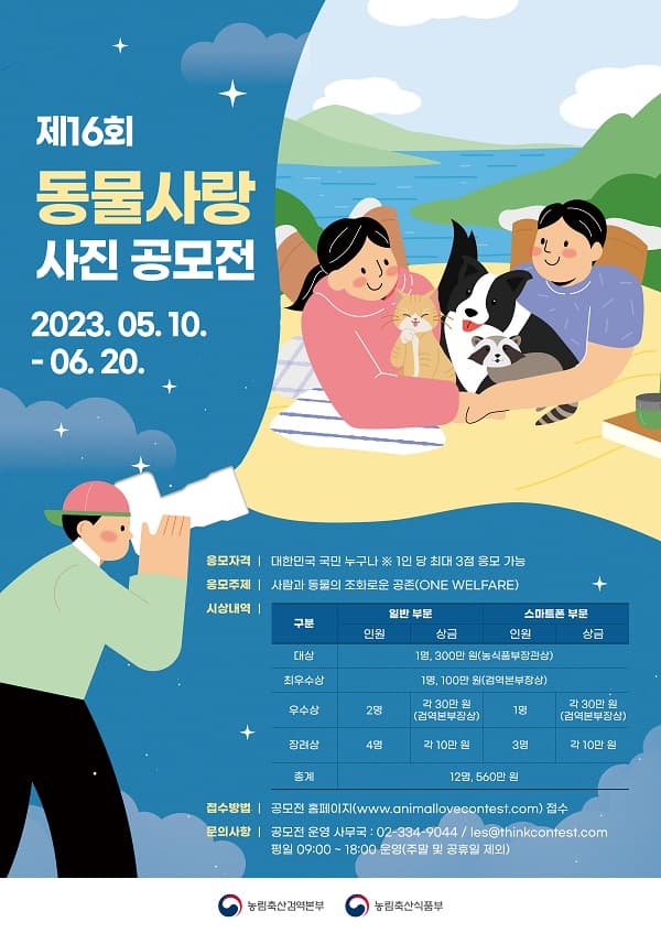 | 구분 | @cols=2:일반 부문 | @cols=2:스마트폰 부문 | | --- | ----- | ----- | ------- | ------- | | 인원 | 상금 | 인원 | 상금 | | | 대상 | @cols=4:1명, 300만원(농식품부장관상) | | 최우수상 | @cols=4:1명, 100만원(검역본부장상) | | 우수상 | 2명 | 각 30만원(검역본부장상) | 1명 | 각 30만원(검역본부장상) | | 장려상 | 4명 | 각 10만원 | 3명 | 각 10만원 | | 총계 | @cols=4:12명, 560만원 |