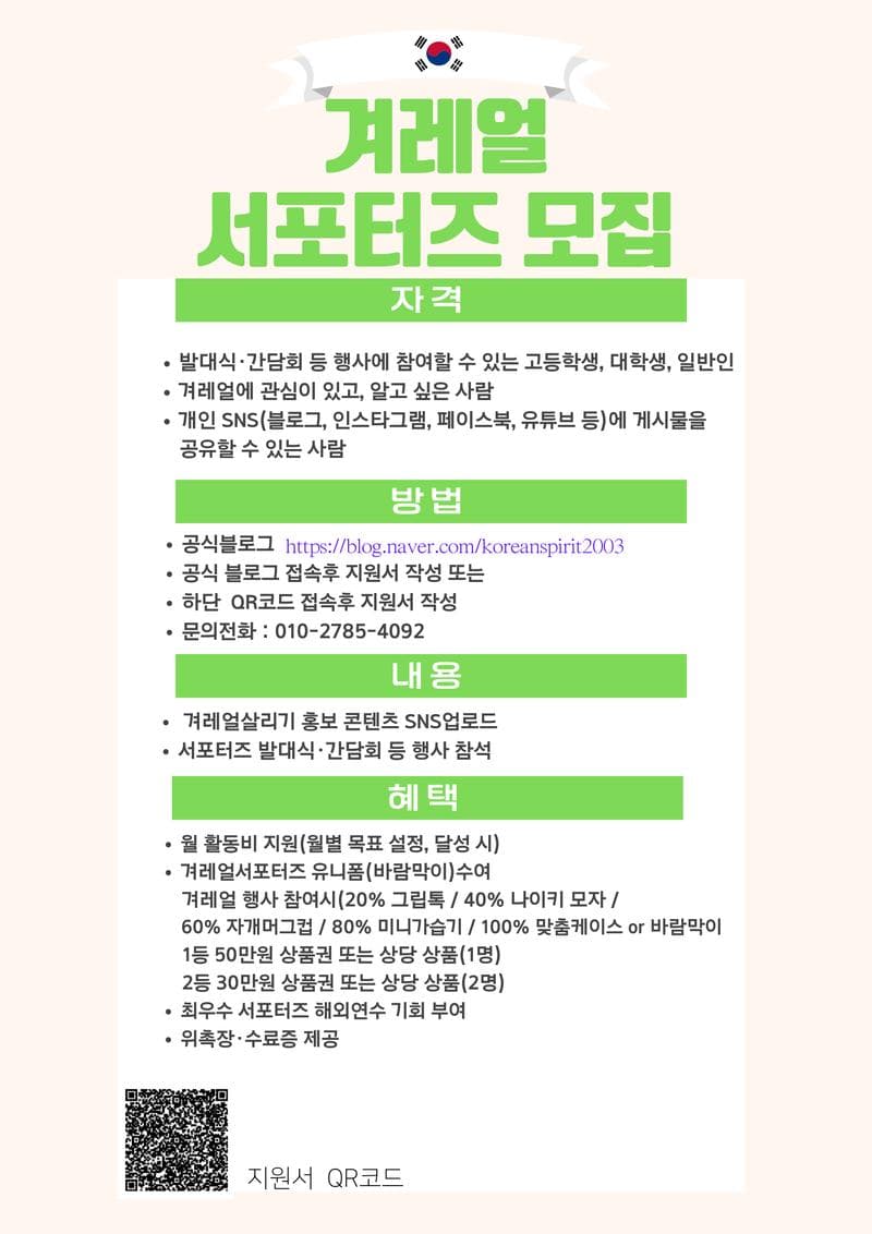 [겨레얼살리기국민운동본부] 2023 겨레얼서포터즈 참가자 모집 겨레얼서포터즈참가자를 다음과 같이 모집하오니 많은 참여 바랍니다. ■ 공모 주제 - 겨레얼 서포터즈 자격으로 발대식ㆍ간담회 ㆍ교육활동 등 행사 참여 - 개인SNSㆍ블로그를 통해 참신한 아이디어를 반영한 겨레얼 홍보 활동 - 겨레얼의 가치와 상생의 문화를 배우고 개인의 역량 강화뿐 아니라 인류의 지속가능한 삶에 기여하는 글로벌리더로 성장하고 싶은 서포터즈를 모집합니다. ■ 활동 내용 - 겨레얼살리기 홍보 콘텐츠 SNS업로드 서포터즈 발대식ㆍ간담회 등 행사 참석 ■ 대외활동 혜택 - 월 활동비 지원(월별 목표 설정, 달성 시) - 겨레얼서포터즈 유니폼(바람막이)수여 겨레얼 행사 참여시(20% 그립톡 / 40%맞춤제작 모자 / 60% 자개머그컵 / 80% 미니가습기 / 100% 맞춤케이스 or 10만원상당 바람막이 1등 70만원 상당 상품 - 최우수 서포터즈 해외연수 기회 부여 - 위촉장ㆍ수료증 제공 ■ 지원 자격 발대식ㆍ간담회 등 행사에 참여할 수 있는 고등학생, 대학생, 일반인 등 겨레얼에 관심이 있고, 알고 싶은 사람 개인 SNS(블로그, 인스타그램, 페이스북, 유튜브 등)에 게시물을 공유할 수 있는 사람 ■ 모집 기간 2023. 04 26\~ ■ 지원 방법 하단의 QR코드 이용, 참여 신청서 작성 http://blog.naver.com/koreanspirit2003 접속-> 참여 신청서 작성 및 제출